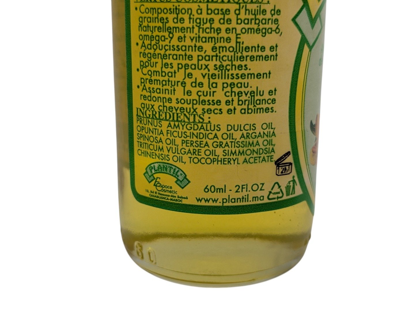 Description: 100% Natural Rich in Antioxidants & Vitamins Comes in glass bottle Personally sourced in Morocco 60ml (2 fl oz) Glass Bottle x 2 = 60ml x 2 = 120ml (4fl oz) The oils in the blend in order of content high to low are: sweet almond, prickly pear oil,argan oil, avacado oil, wheatgerm oil, jojobe oil (sidr oil)