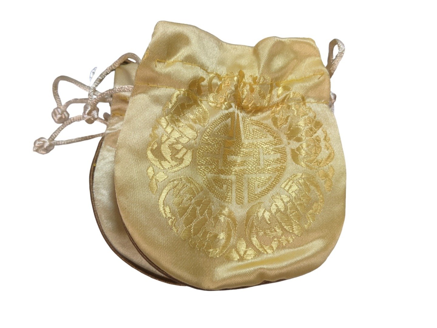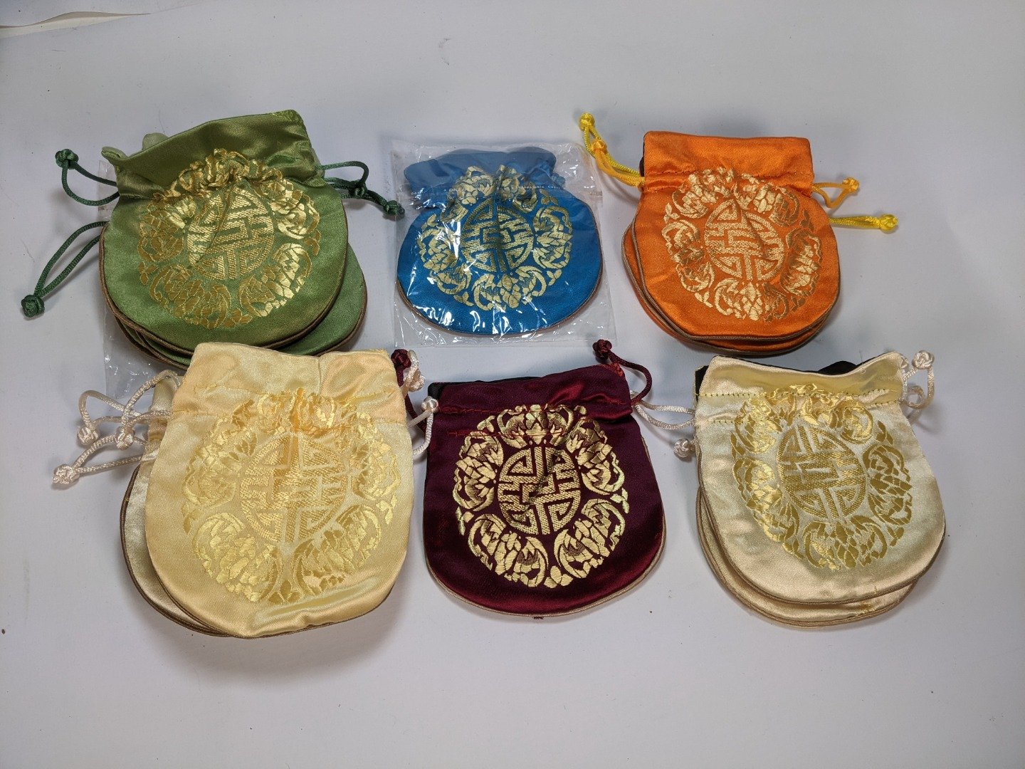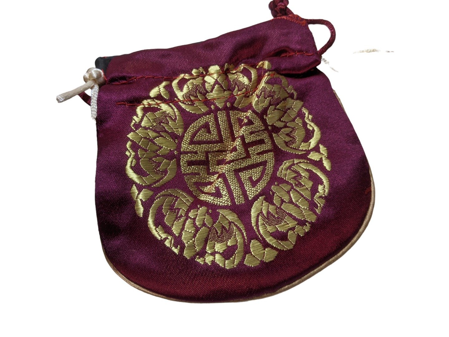 3 x Buddhist Embroidered Pouch PLEASE NOTE: 2 RANDOM COLOURS WILL BE SENT THESE WILL BE 3 DIFFERENT COLOURS IF STOCK ALLOWS. 3 x Beautiful drawstring mala pouch like those used buddhist monks throughout Asia. Embroidered Buddhist motif (may differ from pictured), this is on both sides. The bag has a drawstring close. Measures: 11X X10cm / 4.3 x 4 inches when flat. Weight: 10grams per bag approx. May be used as a coin purse.