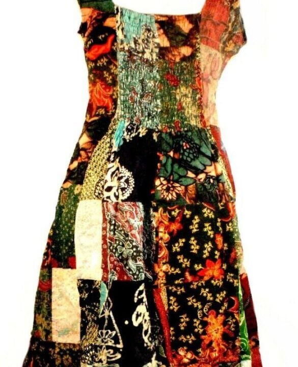 Batik Dress Beautiful size small – medium (uk10 – 14) vintage halter neck Babydoll style dress. Made in Ubud, Bali, by a skilled dressmaker from lots of individual patches of vintage, Batik cloth sewn together. The dress is 89cm long with a halter tie close. Elasticated 30″ – 36″ waist 30″ – 34″ bust Loose and flowing Colour – each dress is unique & different, but generally the skirts come in rough shades of pinks, greens, or browns. A random one will be selected. If you have a specific preference of shade, please check with us before purchasing as stocks vary. Please ensure you fit the above sizes to avoid disappointment please note due to the handmade nature of the garment there will be variation in patches and therefore won’t be the exact same as the one pictured – this is hand made Balinese crafted clothing, not factory made and each is a unique individual item. Made by by a talented dressmaker (Ema) with whom we have built a successful and ongoing small business relationship. Her workshop is based in Bali, Indonesia. These are made from patches of new batik material. Batik is an art form in itself in Indonesia. Its a technique to dye fabrics using wax to create unique designs. This item is made from increasingly rare vintage batik patches. you can spot the difference between old and new batik by the vibrancy of the colours. Vintage batik cloth is in more muted colours. More information on Batik Original product picked by Terrapin Trading. We source all items in-person, in the country they are made. We pay fair trade prices to our makers. e