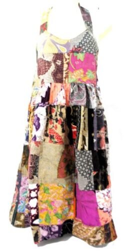 Beautiful size small medium (uk10 14) vintage halter neck Babydoll style dress. Made in Ubud, Bali, by a skilled dressmaker from lots of individual patches of vintage, Batik cloth sewn together. The dress is 89cm long with a halter tie close. Elasticated 30 36 waist 30 34 bust Loose and flowing Colour each dress is unique & different, but generally the skirts come in rough shades of pinks, greens, or browns. A random one will be selected. If you have a specific preference of shade, please check with us before purchasing as stocks vary. Upcycled and redesigned from vintage Balinese Batik cloth. A unique and rare piece, as vintage batik is becoming increasingly difficult to source. Sways and flows. please note due to the handmade nature of the garment there will be variation in patches and therefore wont be the exact same as the one pictured this is hand made Balinese crafted clothing, not factory made and is a unique individual product designed and made by a talented dressmaker with whom we have built a successful and ongoing small business relationship Please also note the material used in these clothes are made from up-cycled antique traditional Balinese batik cloth. The cloth can vary from 20 50 years old. There may be imperfections, frays, wear and blemishes from these clothes as they are vintage and handmade without factory precision instruments. we are happy to refund/ exchange