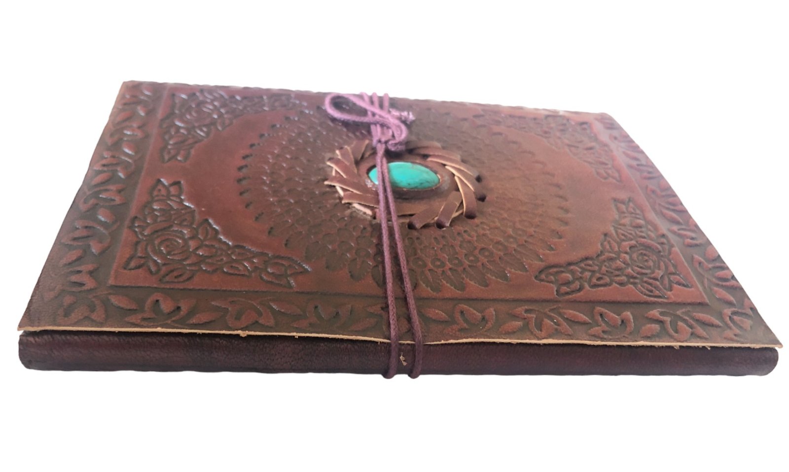 Beautiful Handmade Indian Leather Drawing Pad /Art Sketch Book / Journal – Size 20 x 15cm. 48 sheets of high quality hand made paper within a goatskin leather cover and rope close. The notebook is inlaid with a beautiful semi precious stone. The design on the cover may differ, as may the type of stone (they can be set with turquoise, opal etc).