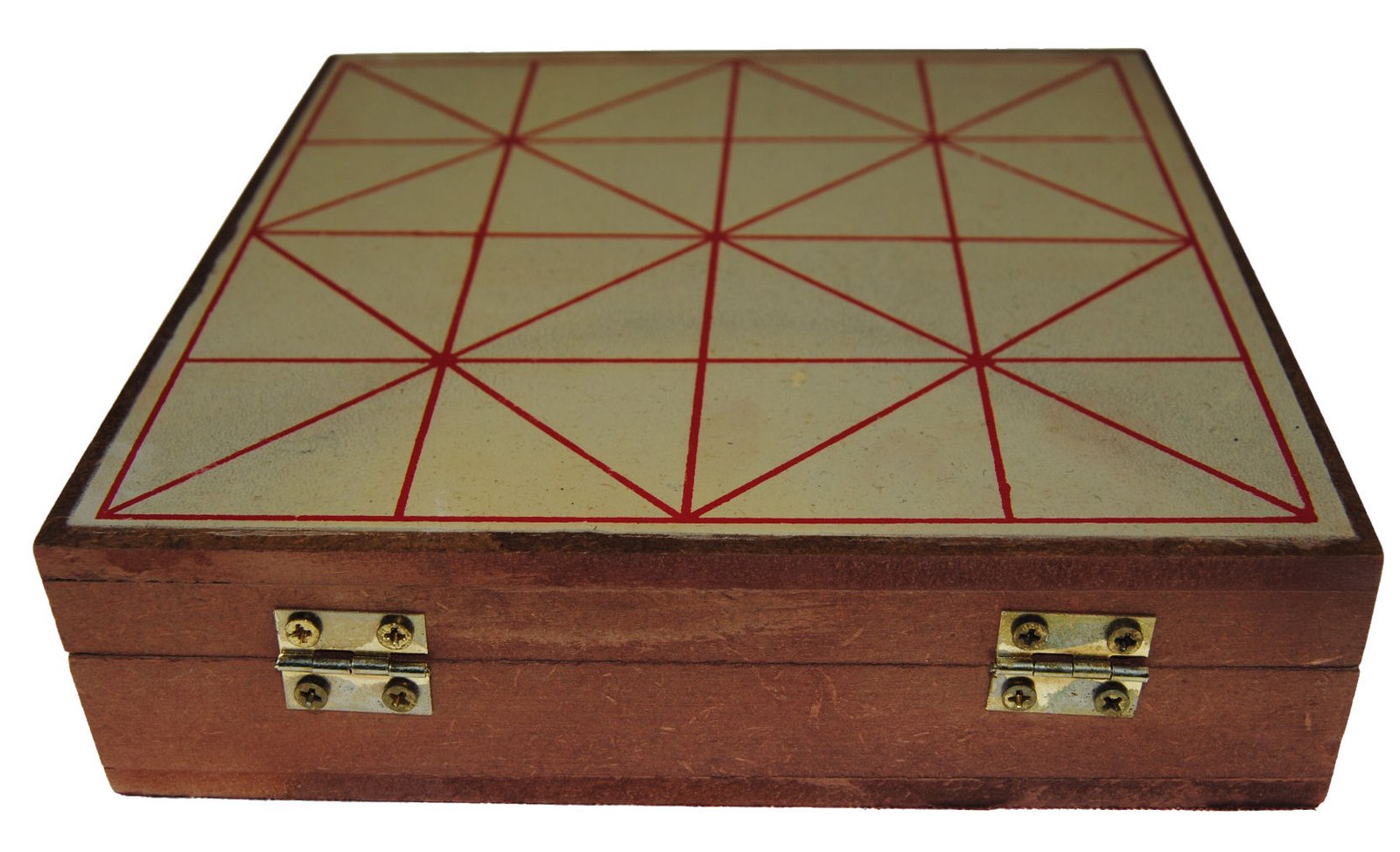 The game of Tigers and Goats is played on a special board of 5 x 5 points connected orthogonally to form a grid. There are also diagonal lines from corner to corner and diagonal lines connecting the midpoint on each side to the adjacent side’s midpoints.