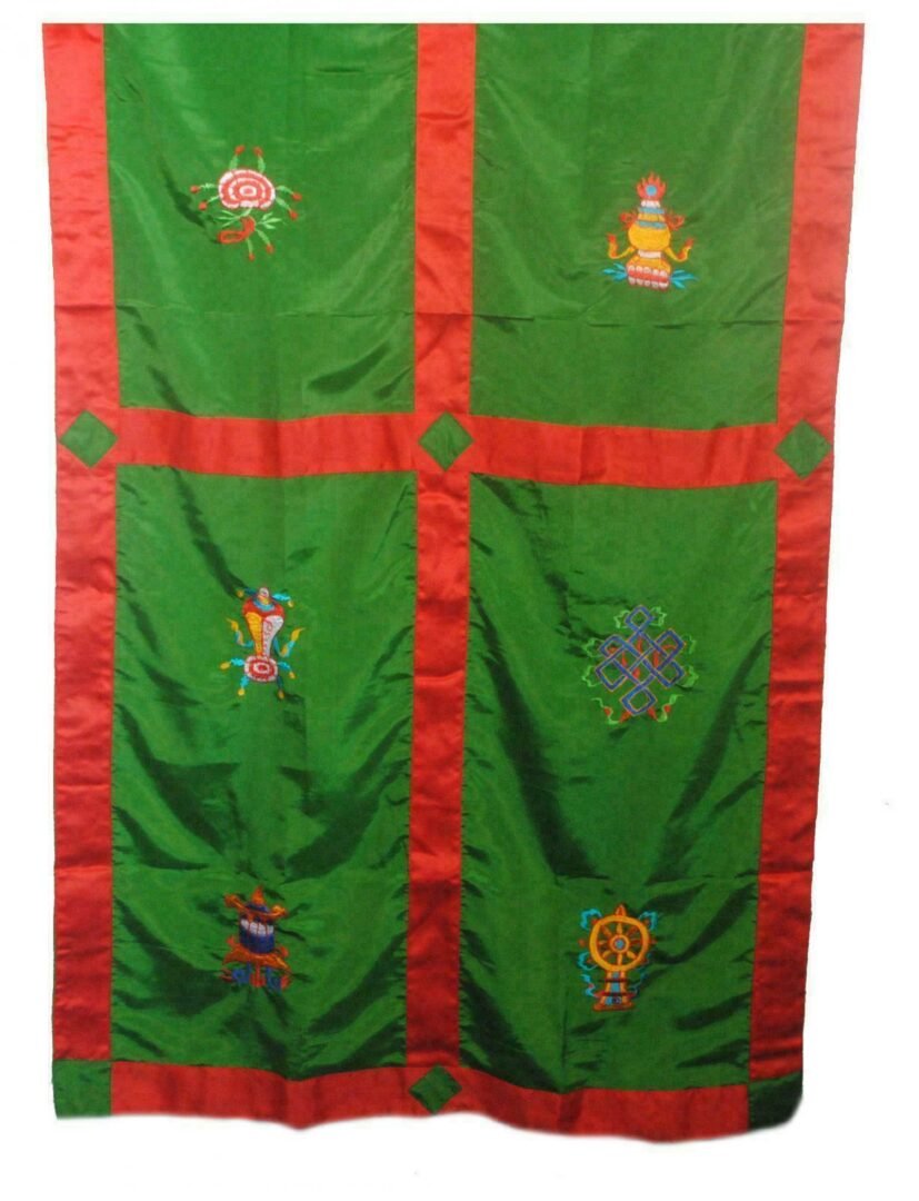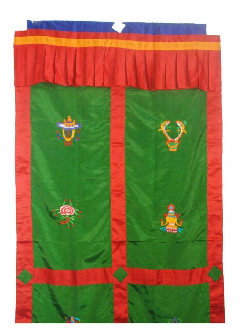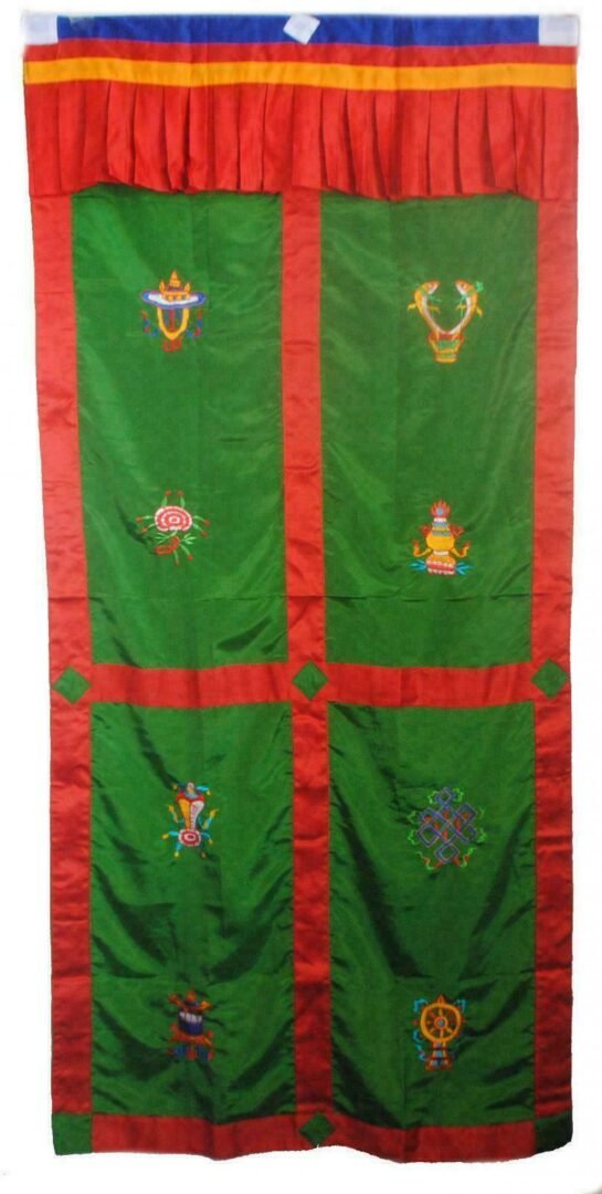 Door Curtain Green – Door Curtains are used both on the inside and front doorways of Nepalese and Tibetan homes. We have a great selection of door curtains – designs with Auspicious Symbols, including Windhorse, Garuda, and Kalachakra.