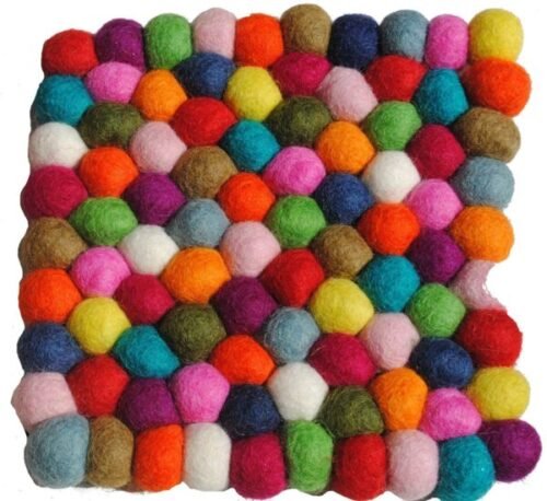 We paid a fair trade price to the Nepali family who made this. Mat measures 20cm diameter around 2.5cm thick Made from felt balls painstakingly stitched together.