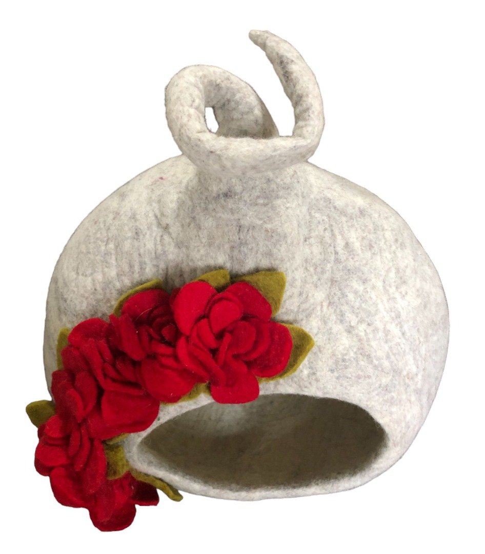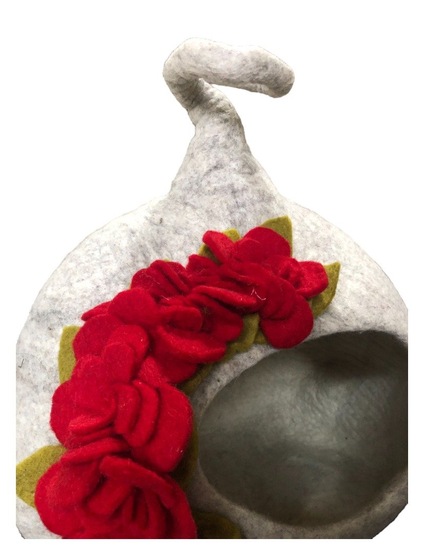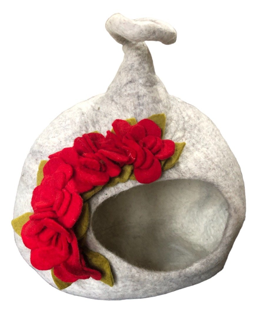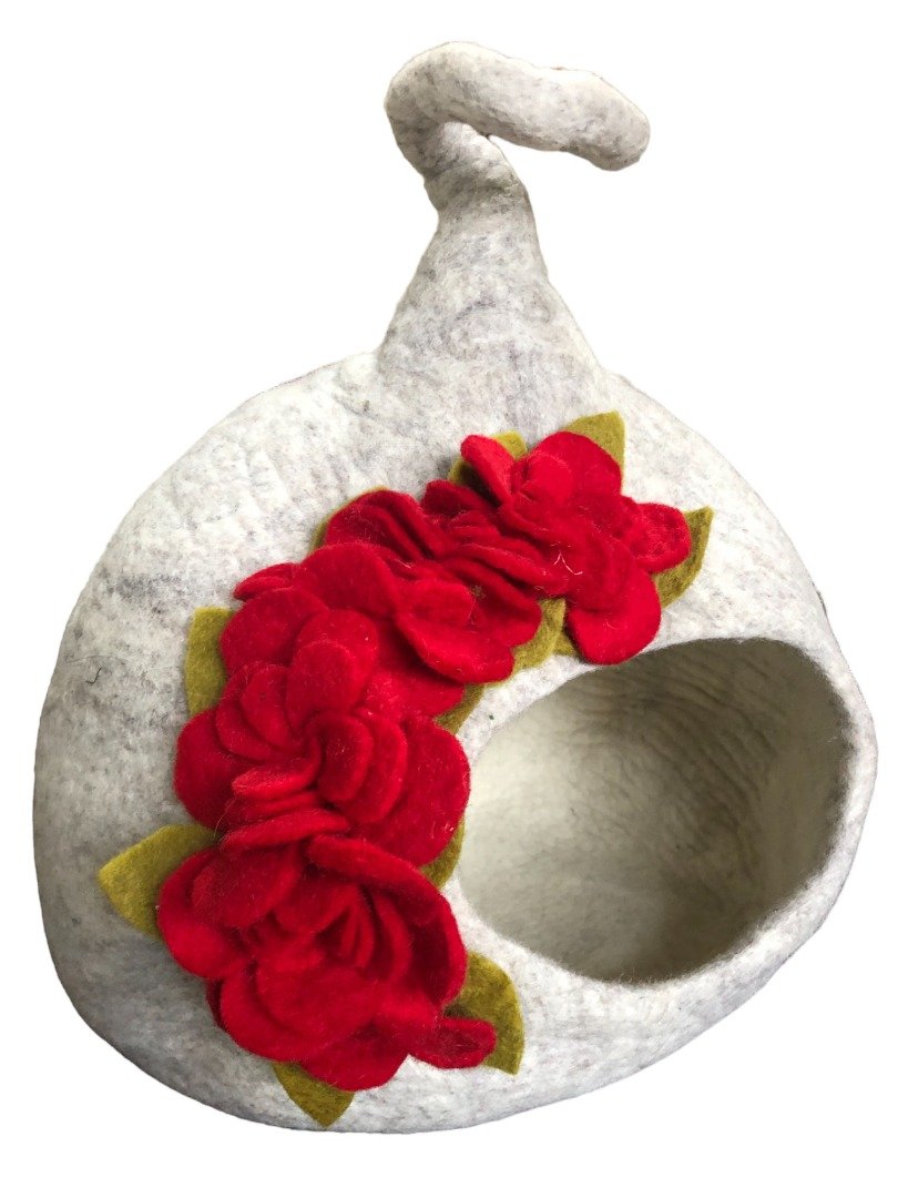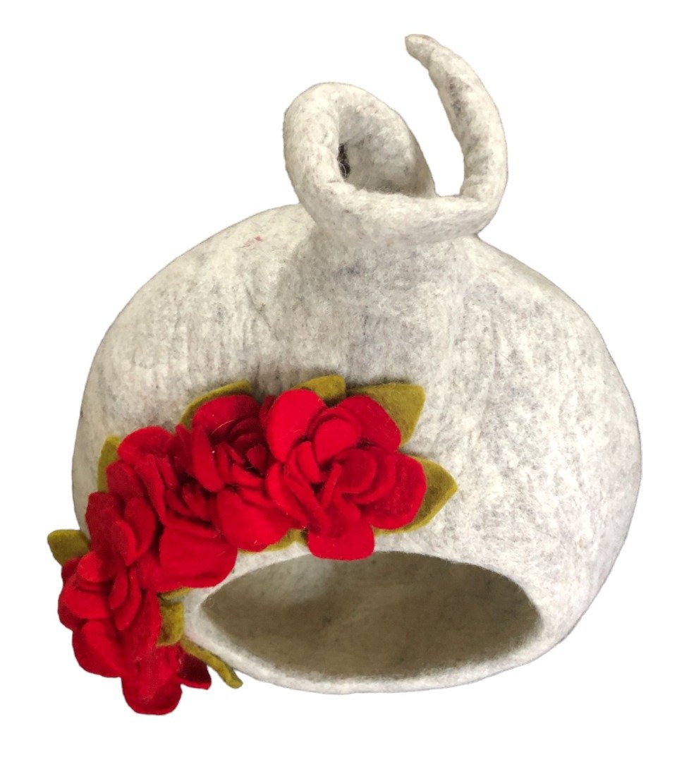 Felt Wool Enclosed Covered Luxury Cat / Small Dog Bed with red flowers. Fair trade.