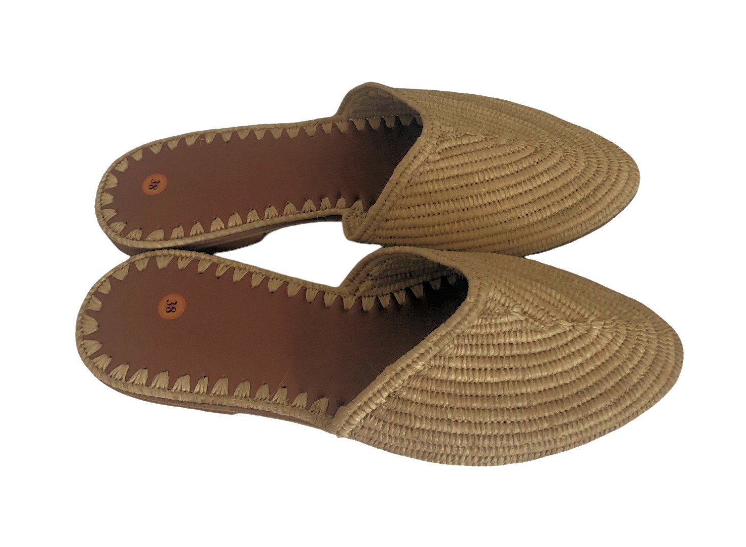 Moroccan Raffia Shoes – Handmade Luxury About this Item Artisanal Excellence: These exquisite raffia shoes are handcrafted by skilled artisans in Essaouira, Morocco, the heart of raffia production. Ethical Fashion: Supporting women’s cooperatives, these slippers are crafted with care and respect for traditional techniques. Comfortable and Breathable: The natural raffia material ensures comfort and breathability, perfect for warm weather. Stylish and Versatile: The simple, elegant design makes these slippers perfect for lounging at home or running errands. Limited Edition: This is a limited run, so grab your pair before they’re gone! Sizing Guide: EU36=UK3/US5 | EU37=UK4/US6 | EU38=UK4/US7 | EU39=UK4/US8 | EU40=UK5/US9 | EU41=UK6/US10 | EU42=UK7/US11 Please note: These slippers are sized according to being worn barefoot. If you intend to wear with foot coverings adjust your sizing accordingly i.e. go up a size. Why Choose Our Products? Authenticity: We personally oversee the production process in Morocco, ensuring the highest quality. Ethical Sourcing: We support local artisans and fair trade practices. Unique Finds: Discover a wide range of authentic Moroccan products in our store. Search Terms: Moroccan slippers, raffia shoes, handmade slippers, ethical fashion, comfortable footwear, women’s slippers, Moroccan sandals, Essaouira, Sous Massa Artisanal Excellence: These exquisite raffia shoes are handcrafted by skilled artisans in Essaouira, Morocco, the heart of raffia production. Ethical Fashion: Supporting women’s cooperatives, these slippers are crafted with care and respect for traditional techniques. Comfortable and Breathable: The natural raffia material ensures comfort and breathability, perfect for warm weather. EU36=UK3/US5 | EU37=UK4/US6 | EU38=UK4/US7 | EU39=UK4/US8 | EU40=UK5/US9 | EU41=UK6/US10 | EU42=UK7/US11 Unique Finds: Discover a wide range of authentic Moroccan products in our store.