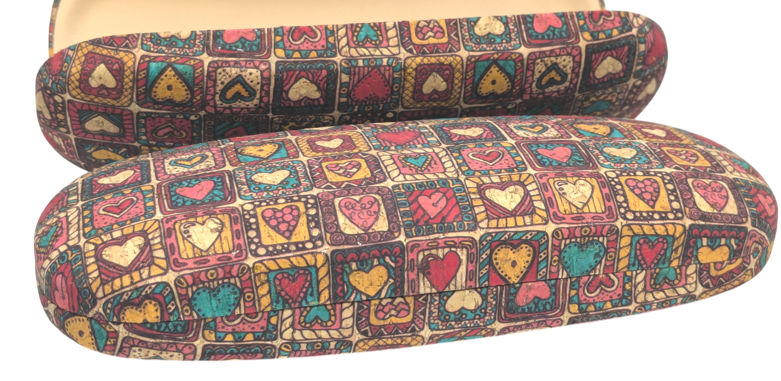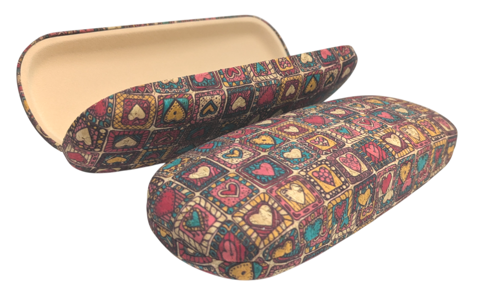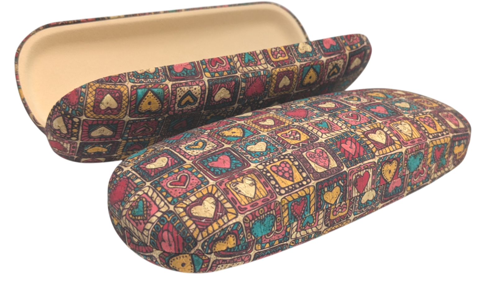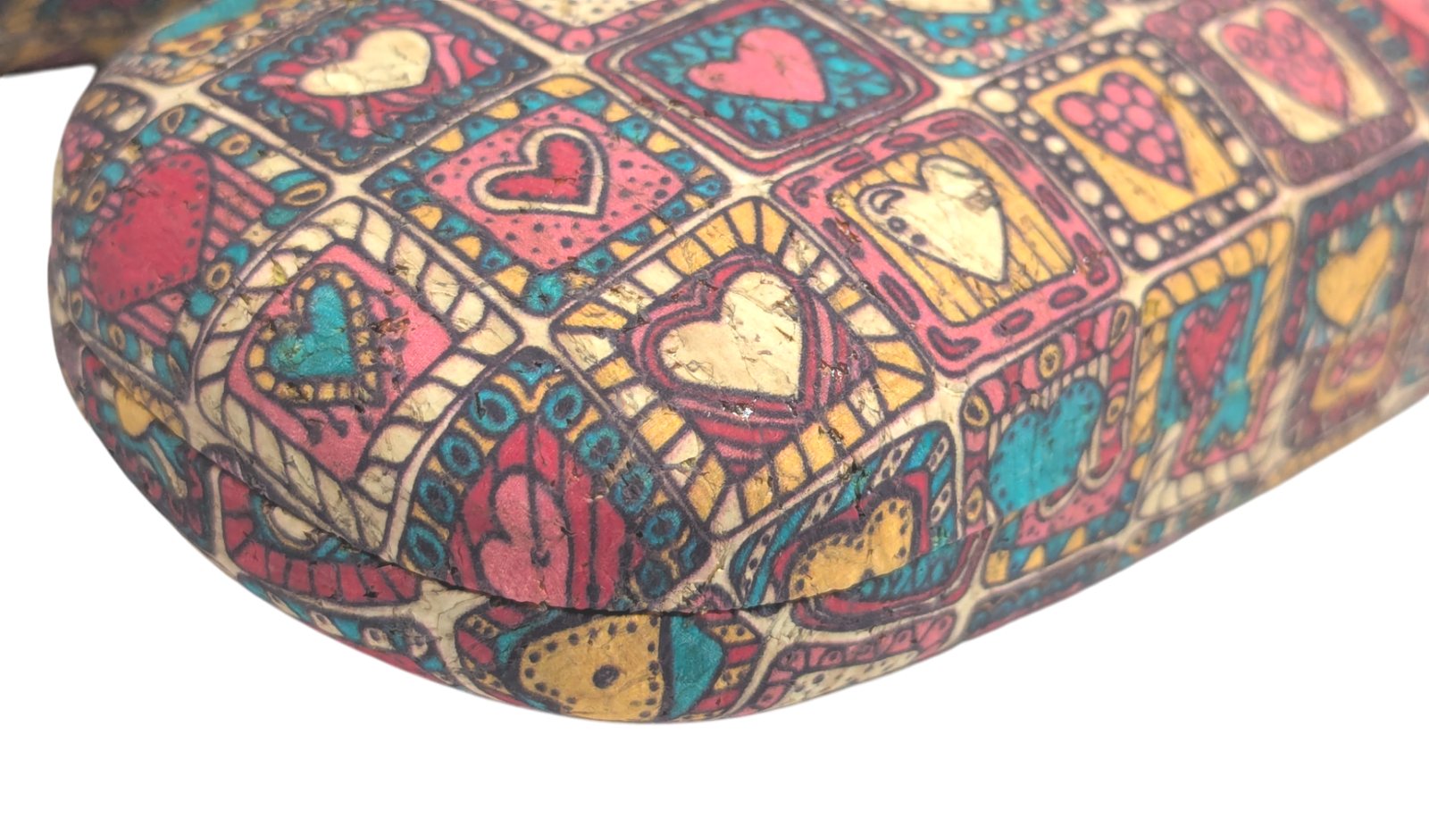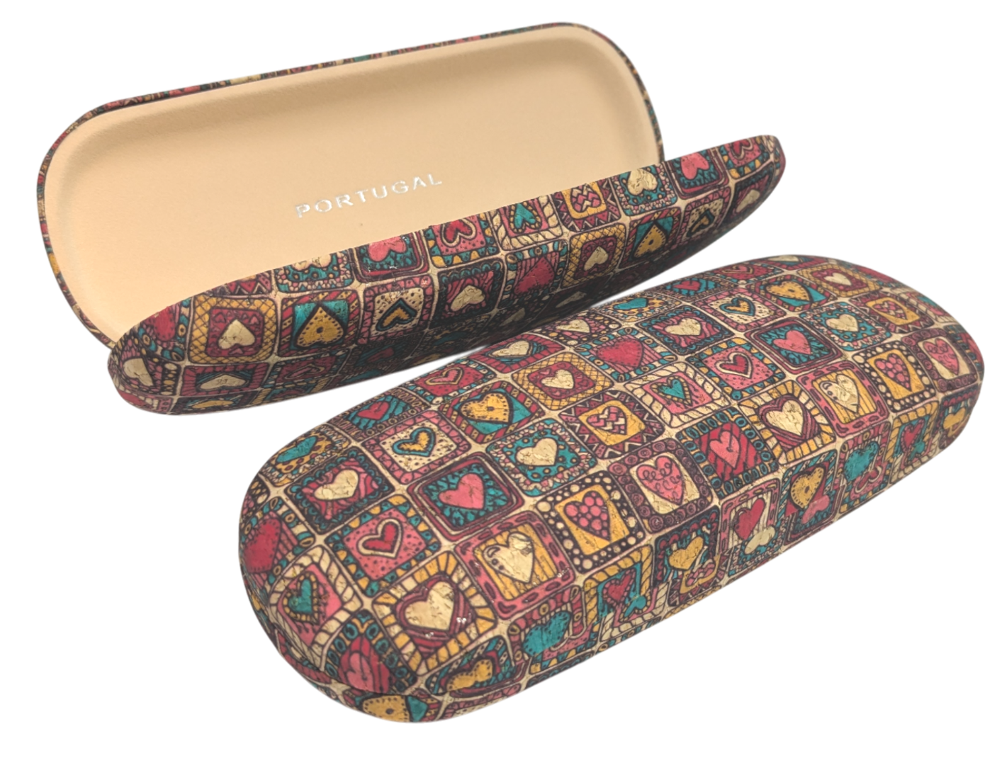 Sustainable Protection for Your Eyewear Protect your glasses with the natural beauty of Portuguese cork. This hard-shell glasses case combines rugged durability with an eco-friendly soul. Adorned with a vibrant, multicolored heart pattern, it’s not just a protector—it’s a statement piece that reflects your commitment to sustainable fashion.
