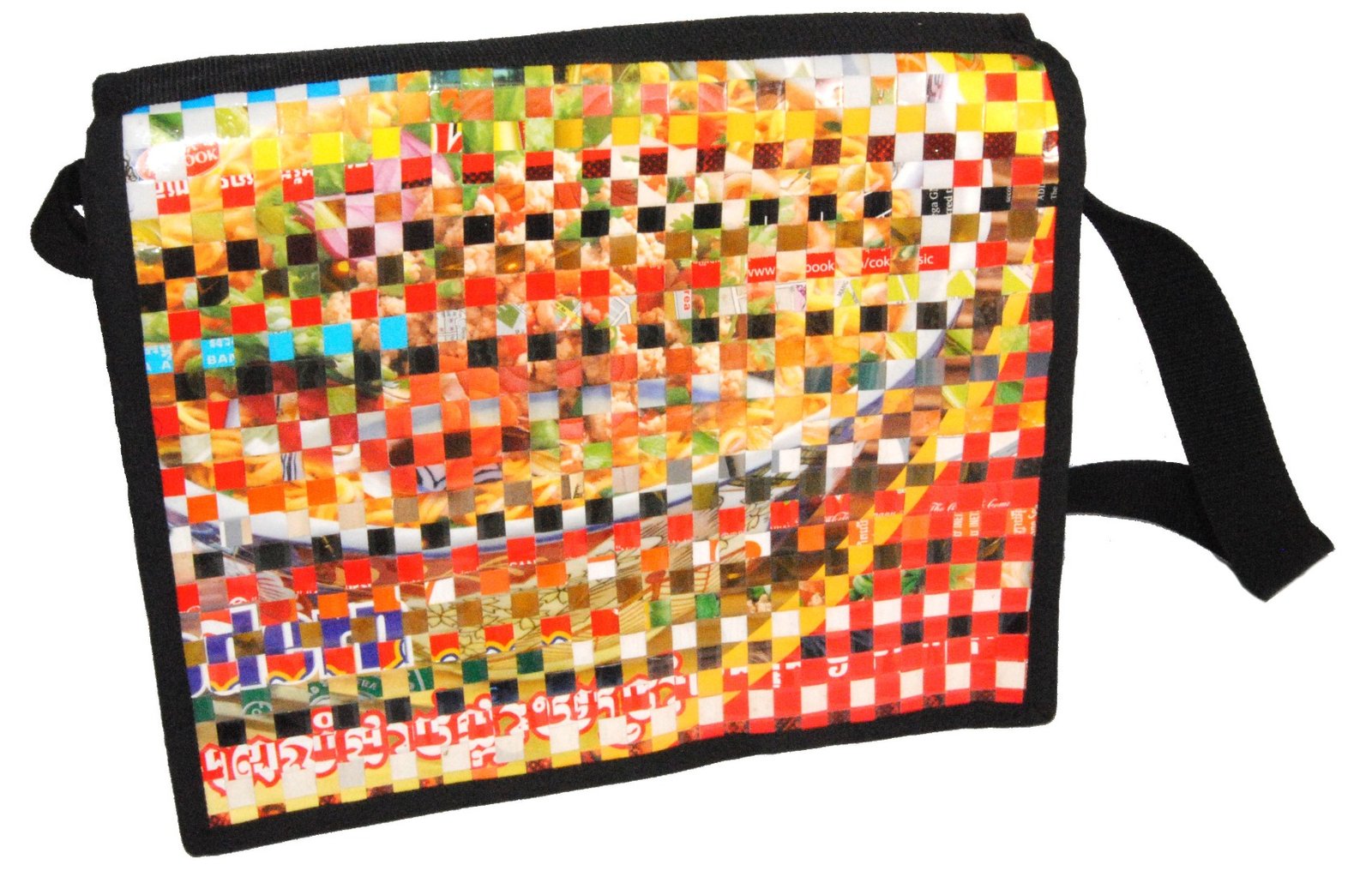 Upcycled Durable Laptop Notebook Messenger Bag / case – Recycled Bright Cambodian Food Packaging