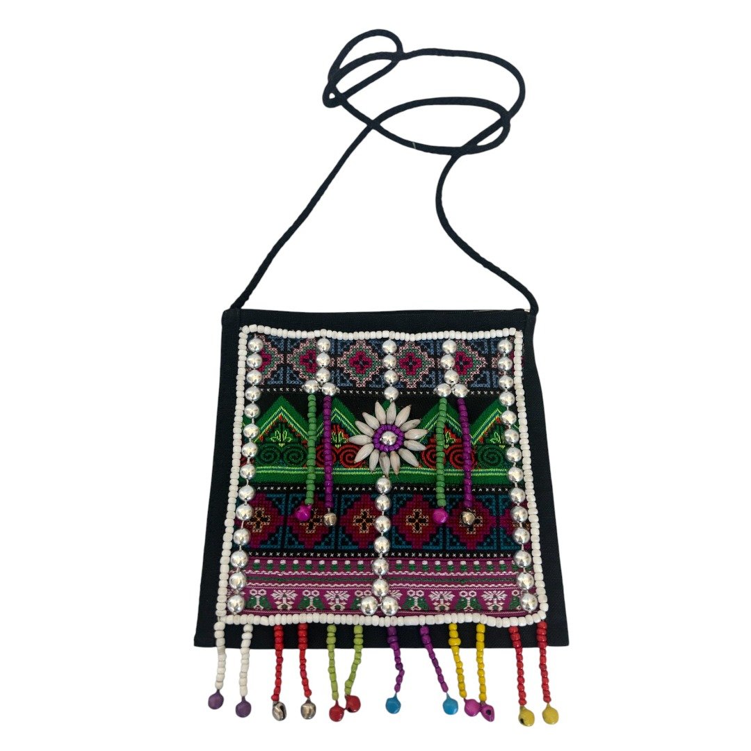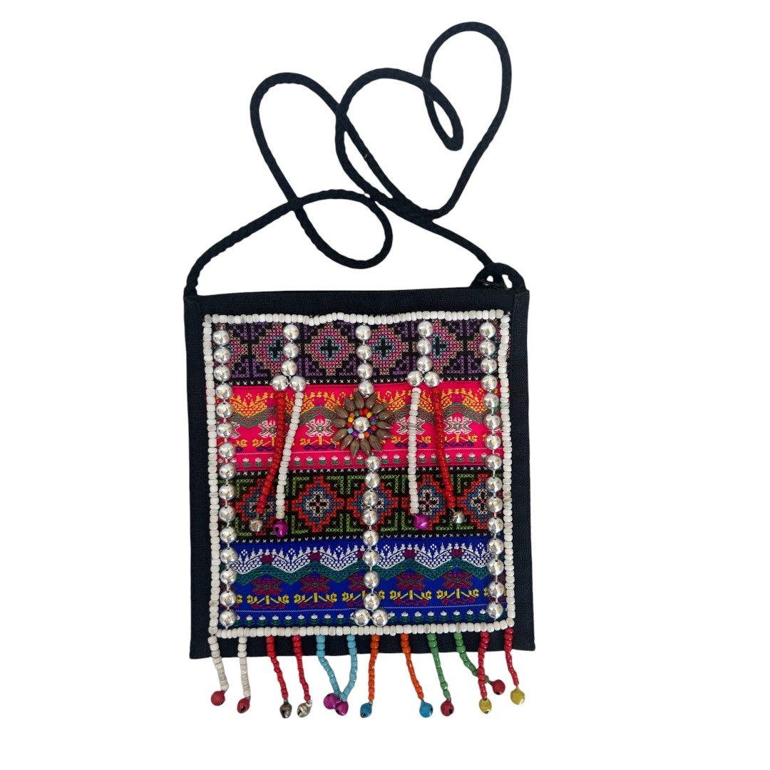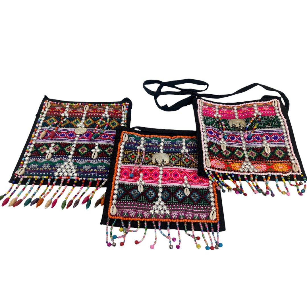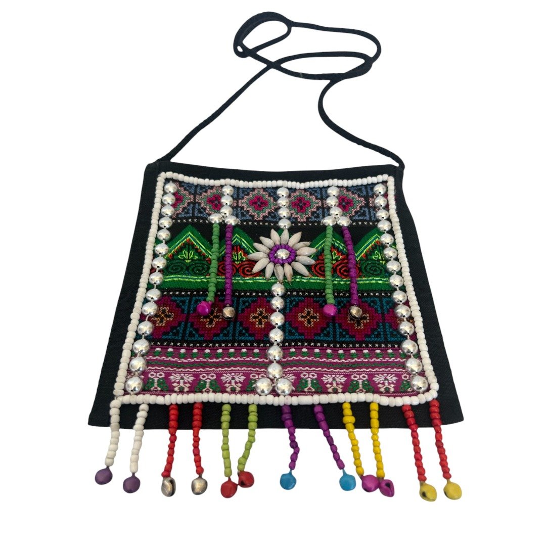 Hmong Funky Festival Bag Stunning madecrafted Hmong Tribal Bag. Each is a testament to the incredible skill and vibrant traditions of the Hmong people of Northern Thailand. These bags are unique, detailed and bursting with colour. Intricately decorated with beads, traditional fabric, stitching and tassles reflecting the rich cultural heritage of the Hmong tribes. No two bags are exactly alike as each are made by hand. Key features: Secure Storage: Features zip close for easy access to your essentials Perfectly Sized: Compact yet spacious enough for your wallet, keys etc. Dimensions: 21cm (L) x 19.5cm (W). Weight 120g Versatile Wear: Shoulder strap Perfect bag for a festival or travel, clubbing or for everyday wear. Stand out and add a splash of colour to your outfit. Ethical Choice: This beautiful bag is fair trade and ethically sourced directly from Northern Thailand. By purchasing this bag, you are: Supporting Traditional Crafts: Helping to keep the ancient art of Hmong embroidery alive for future generations. Empowering Communities: Providing sustainable income and fair wages to the talented artisans of the region. Making a Positive Impact: Contributing to the well-being of the ethical tribal people of Northern Thailand. (Please note: each is unique, no 2 are identical and a random bag will be selected. This advert is for only one only, multiple shown in photos are to show typical variations you might expect)