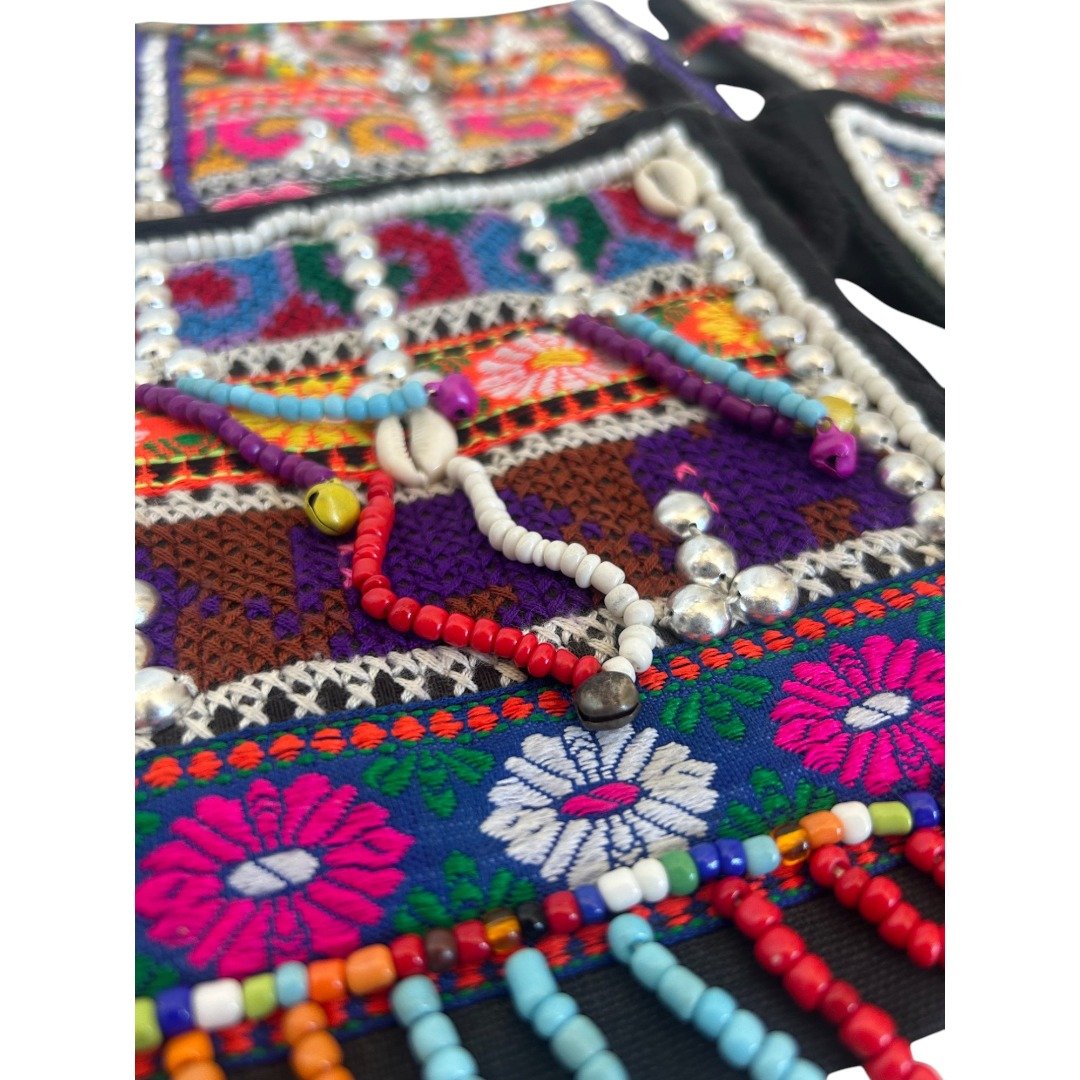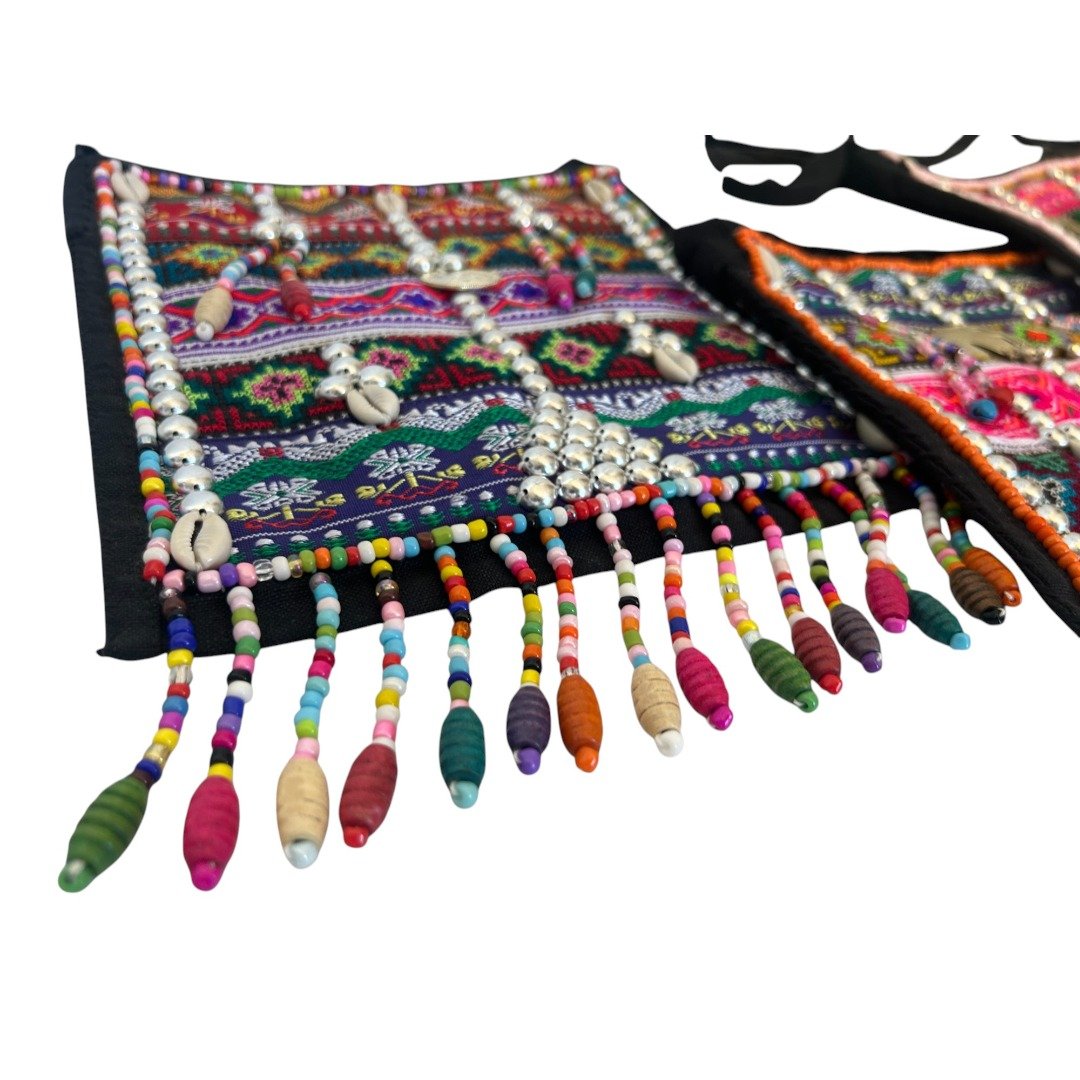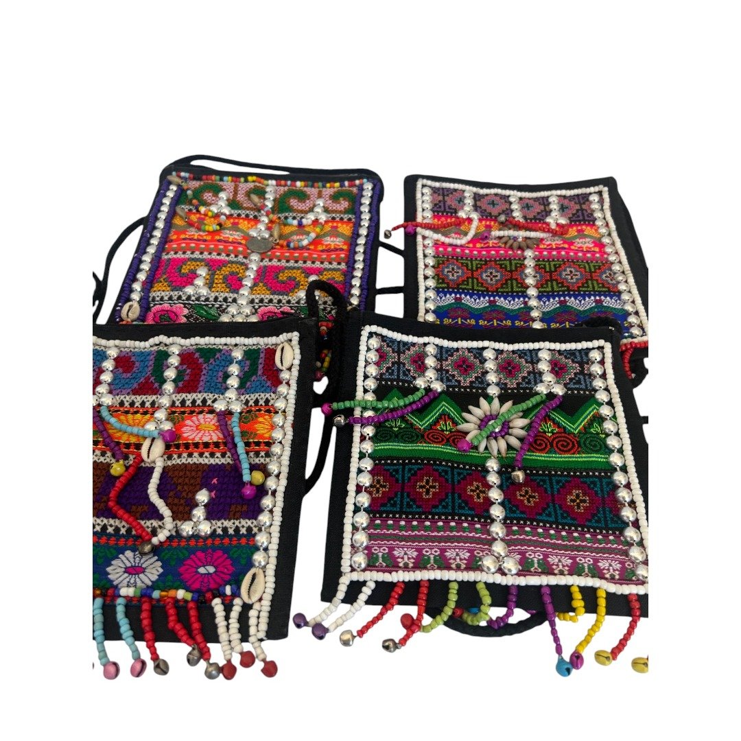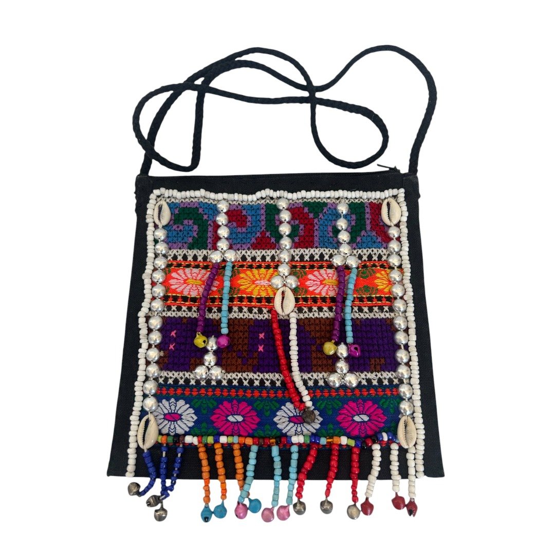 Hmong Funky Festival Bag Stunning madecrafted Hmong Tribal Bag. Each is a testament to the incredible skill and vibrant traditions of the Hmong people of Northern Thailand. These bags are unique, detailed and bursting with colour. Intricately decorated with beads, traditional fabric, stitching and tassles reflecting the rich cultural heritage of the Hmong tribes. No two bags are exactly alike as each are made by hand. Key features: Secure Storage: Features zip close for easy access to your essentials Perfectly Sized: Compact yet spacious enough for your wallet, keys etc. Dimensions: 21cm (L) x 19.5cm (W). Weight 120g Versatile Wear: Shoulder strap Perfect bag for a festival or travel, clubbing or for everyday wear. Stand out and add a splash of colour to your outfit. Ethical Choice: This beautiful bag is fair trade and ethically sourced directly from Northern Thailand. By purchasing this bag, you are: Supporting Traditional Crafts: Helping to keep the ancient art of Hmong embroidery alive for future generations. Empowering Communities: Providing sustainable income and fair wages to the talented artisans of the region. Making a Positive Impact: Contributing to the well-being of the ethical tribal people of Northern Thailand. (Please note: each is unique, no 2 are identical and a random bag will be selected. This advert is for only one only, multiple shown in photos are to show typical variations you might expect)