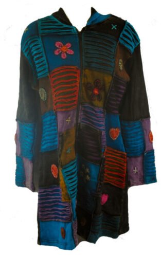 Long Hippy Coat. Cool patchwork maxi length hooded coat jacket.Real patches sewn together and decorated with various designs.