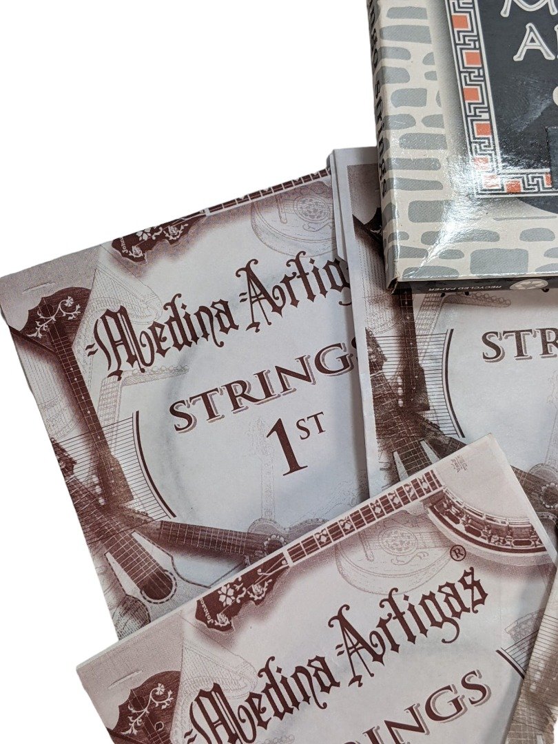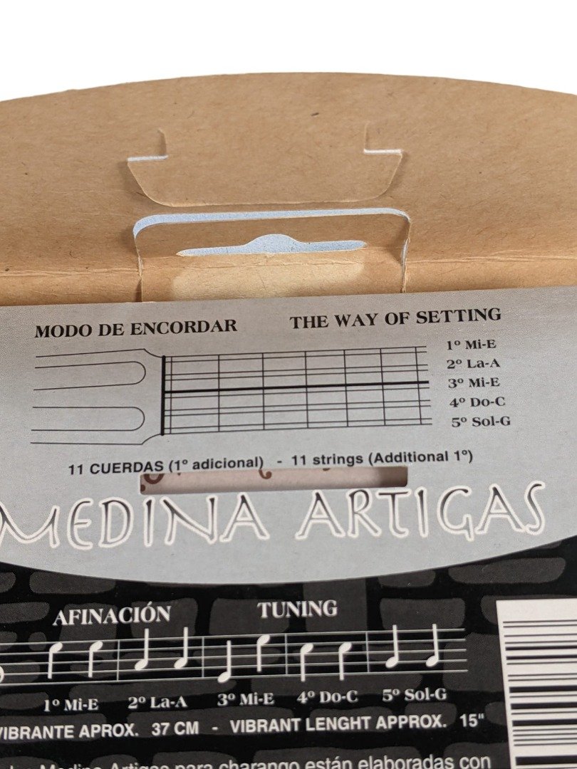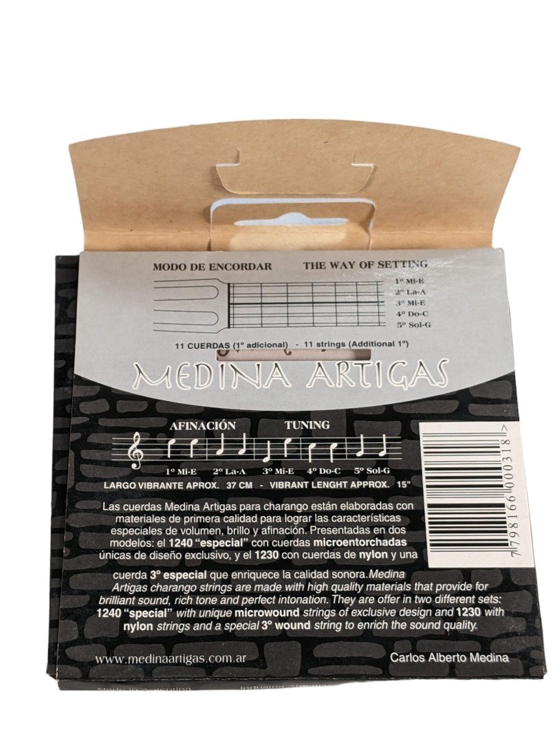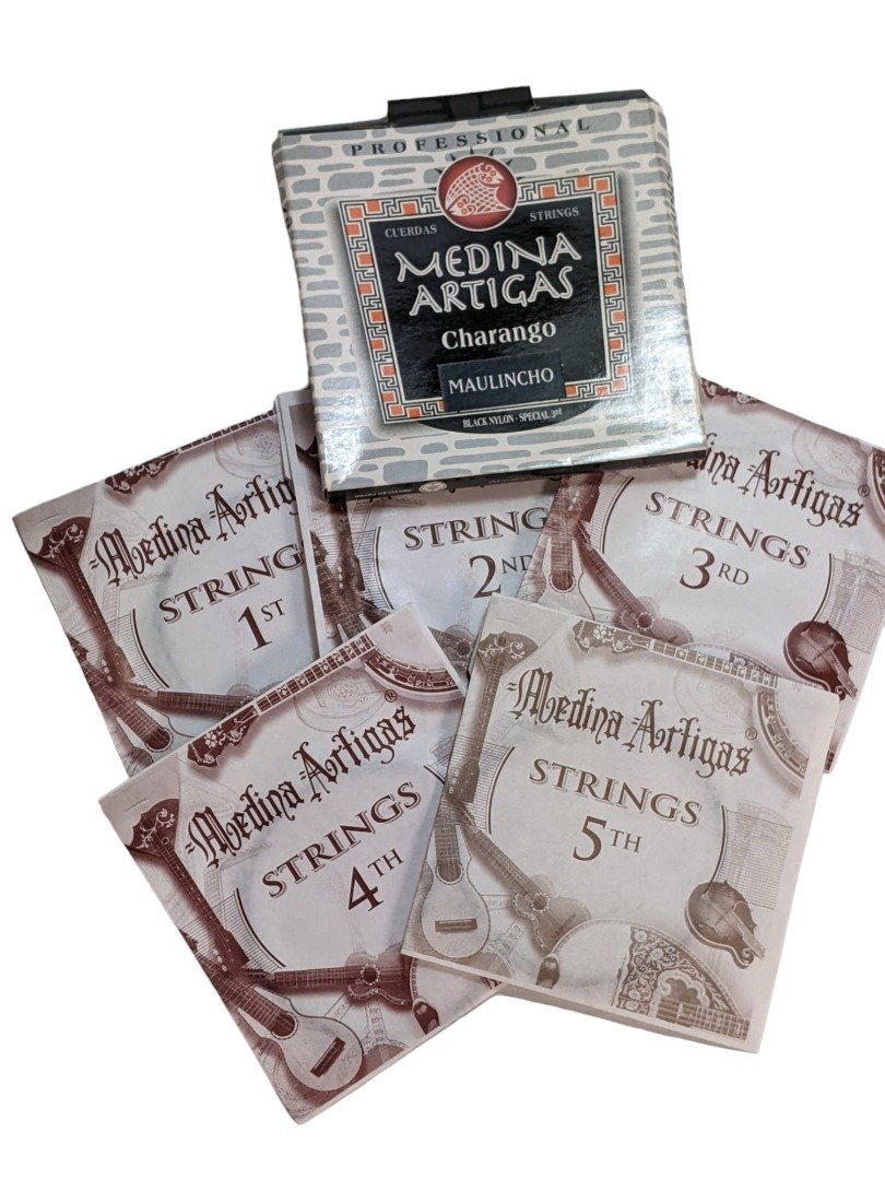 These are Pro Quality strings by Medina Artigas. Made in Argentina. The Medina Artigas Charango family strings are made with high quality materials that provide a brilliant sound and perfect intonation. 11 Strings 3 x Mi / E 2 x La / A 2 x Mi / E 2 x Do / C 2 x Sol / G Our Bolivian Charangos are imported direct from La Paz and already come with strings. When the time comes to replace them we recommend Medina Artigas if you want profession standard strings. Good Sound, Strength & Intonation Background to the Charango Inspired by Spanish guitars carried by the colonists, some of the first charangos appeared in the 18th century. The charango has become one of the most popular instruments in the Andean regions of Bolivia, Peru and northern Argentina.