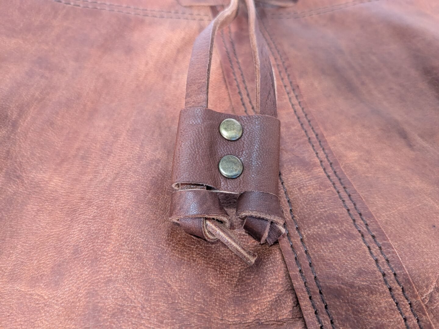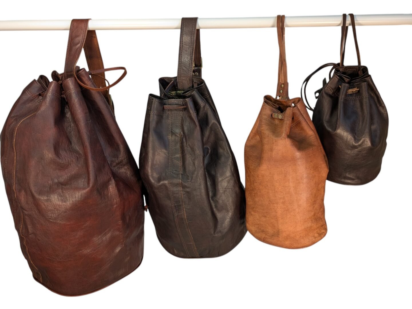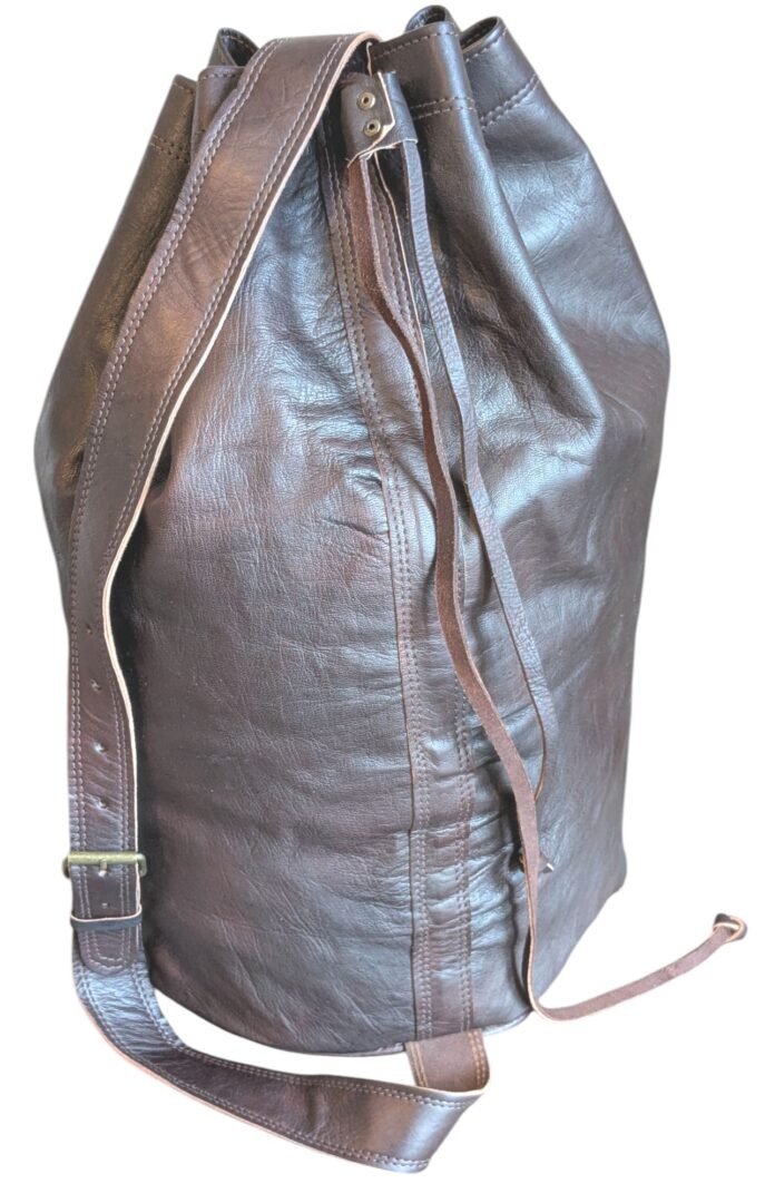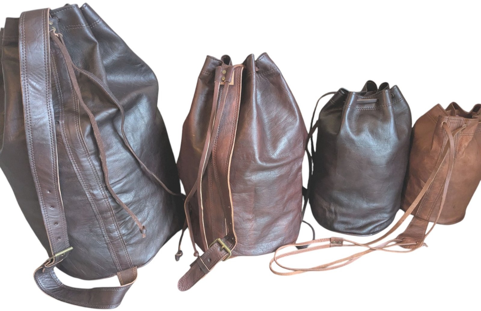 Moroccan Leather Duffle Bag : Our 100% organic leather bucket bags are meticulously handcrafted in Morocco using traditional techniques. SMALL: (unlined): Height: 29 cm / 11.4 in, Width: 28 cm / 11.0 in, Depth: 20 cm / 7.9 in, Max Volume: 6.8 L / 1.80 gal. Weight 0.3g / 0.73lbs – Comfortably fits an tablet and makes a great day bag. MEDIUM: Height 37cm / 14.57in, Width 33cm / 12.99in, Depth 21cm / 8.27in, Max. Volume 11.3L / 2.99gal. Weight 0.4kg / 0.88lbs – Fits a laptop and A4 folders and is perfect for a day out, school or uni. Includes a zipped pocket LARGE: Height 49cm / 19.29in, Width 46cm / 18.11in, Depth 29cm / 11.42in, Max. Volume 34.6L / 9.14gal. Weight 0.7kg / 1.54lbs – Fully lined and has a inner zipped pocket. Has an adjustable shoulder strap in addition to the drawstring. Space enough for gym or a weekend away. EXTRA LARGE: Height 60cm / 23.62in, Width 56cm / 22.05in, Depth 35cm / 13.78in, Max. Volume 54.47L / 14.38gal. Weight 1kg / 2.2lbs