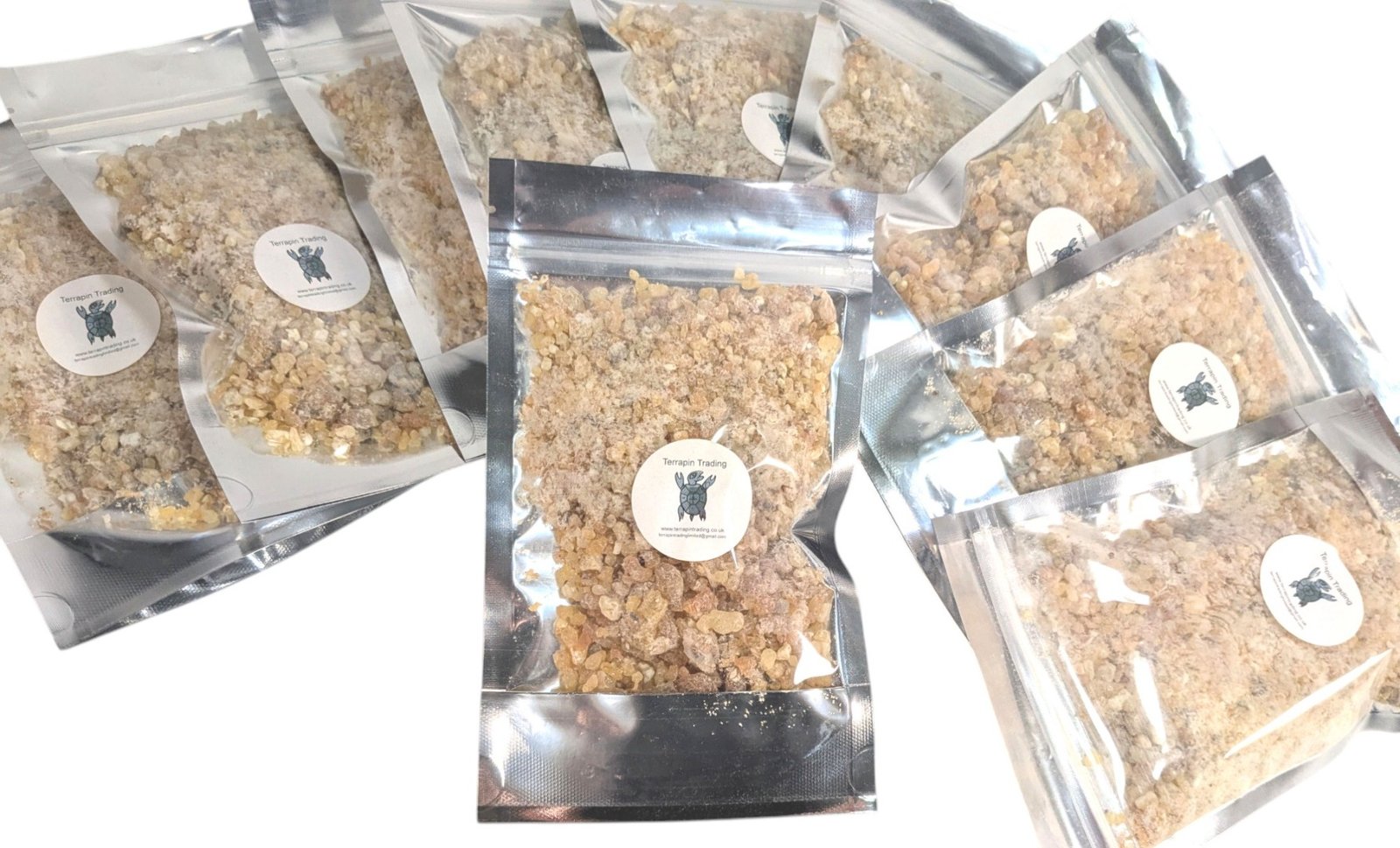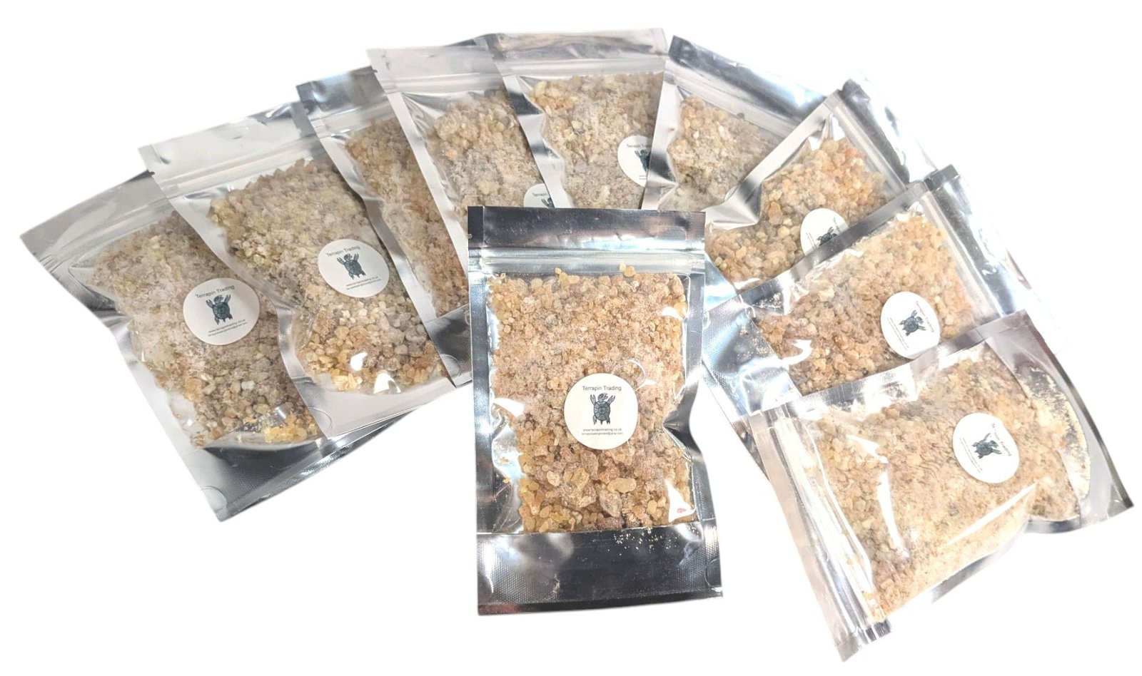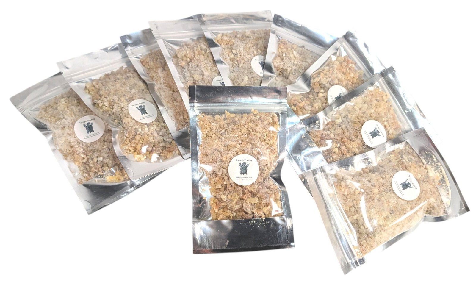 100g (3.5oz) Authentic Moroccan Frankincense Resin – Premium Grade Indulge in the captivating aroma of our premium Moroccan Frankincense Resin. Sourced ethically from the ancient Frankincense trees of the Moroccan Sahara, this 3.5oz bag offers a rich, earthy fragrance with subtle notes of citrus and pine. Premium Quality: Hand-selected for its exceptional quality and purity. Versatile Uses: Ideal for burning in incense burners, smudging rituals, aromatherapy, and crafting natural perfumes. Ethically Sourced: Supporting sustainable and traditional harvesting practices in Morocco. Storage: Supplied in zip-lock standing bags to keep airtight. Background The trees start producing resin at about eight to 10 years old. Tapping is done two to three times per year with the final taps producing the best tears because of their higher aromatic terpene, sesquiterpene and diterpene content. Generally speaking, the more opaque resins are the best quality.