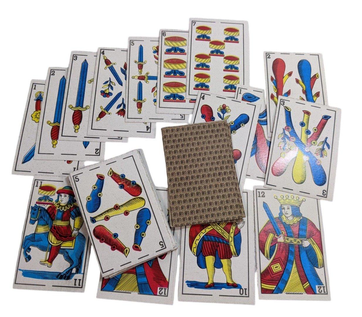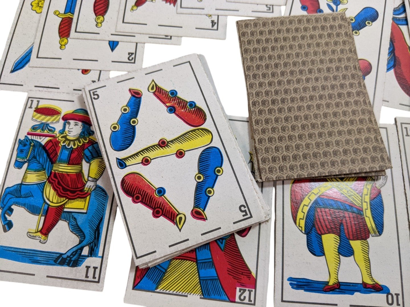 Full Set of Moroccan Ronda cards. We include a printed set of instructions on how to play the game. Personally sourced in Morocco this summer. Ronda is a popular game in Morocco, but not just Rabat and Marrakesh, but all over theextremely diverse country. Due to this fact, the game has French, Spanish, and Arabic forms. Morocco Ronda Cards uses a 40 card deck. The deck has 4suits: khal (clubs), copas (cups), chbada (swords), and dhab or dinar (coins). The cardswithin each suit are numbered from 1 to 7 then 10 to 12 where 10, 11, and 12 are the jack,horse, and king, respectively. This is a 2 or 4 player game, with the 4 player game consisting of 2 sets of partners.