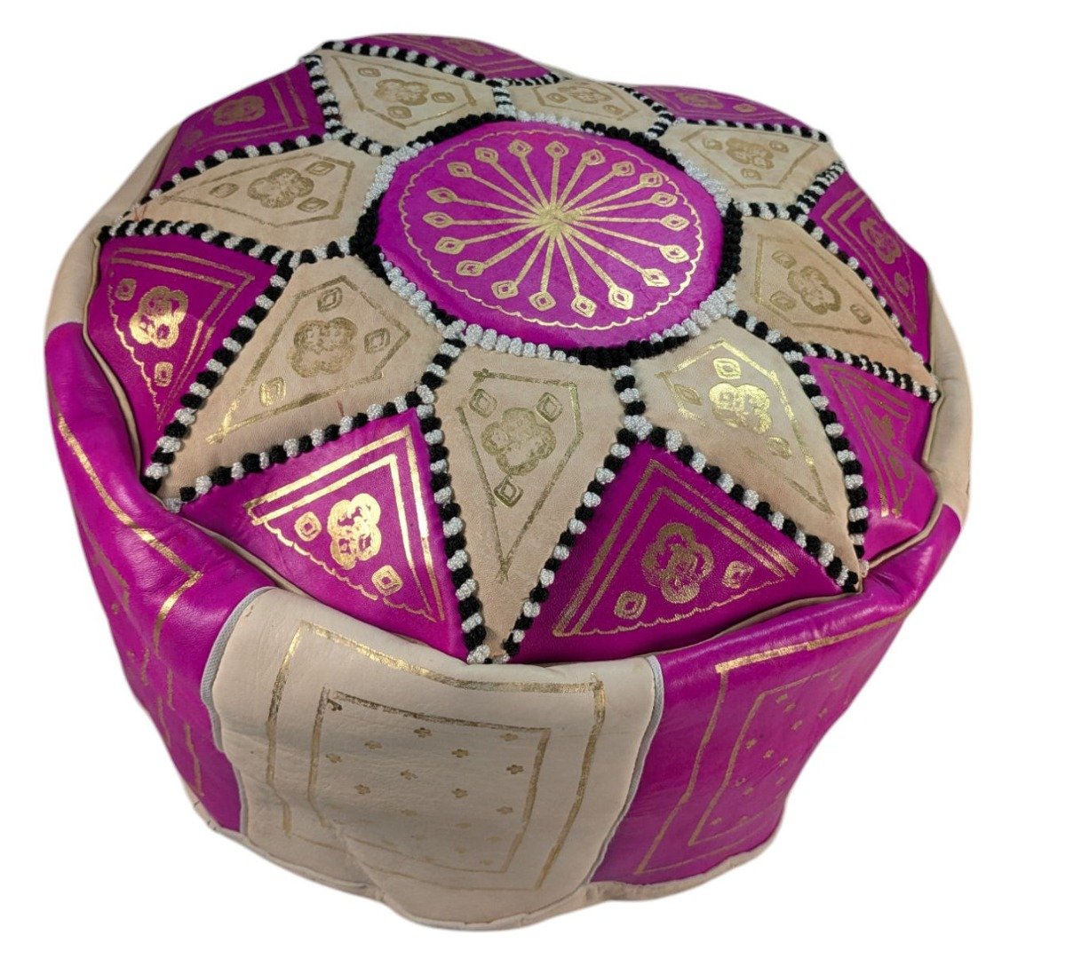 Genuine Moroccan Leather Pouffe Made by the world renowned artisans of Marrakech. The pouffe is designed and produced in the traditional way but using contemporary, modern design. The leather is organically tanned and the pouffe is hand crafted by Moroccan artisans in the souks and tanneries of Marrakech. All the leather is hand-tanned, hand cut and hand-dyed in the traditional way. Due to the natural nature of this product there may be occasional blemishes on the pouffes as to be expected, it isnt a factory made item and the imperfections add to the authenticity of the product. If however you are in any way unhappy with the item, please just drop us an email or message before leaving feedback or opening a case against us as we really try to sort out all problems, we want our customers to be fully satisfied with their purchase and if not we offer a full refund for any reason. Please note the pouffes (like all for sale online) are posted unstuffed for ease or posting – they can be filled with any soft material, no special stuffing is required, old linen (duvets are excellent~) or unwanted clothing suffices. Approx Product Dimensions: 42cm x 20cm RRP: 74.99