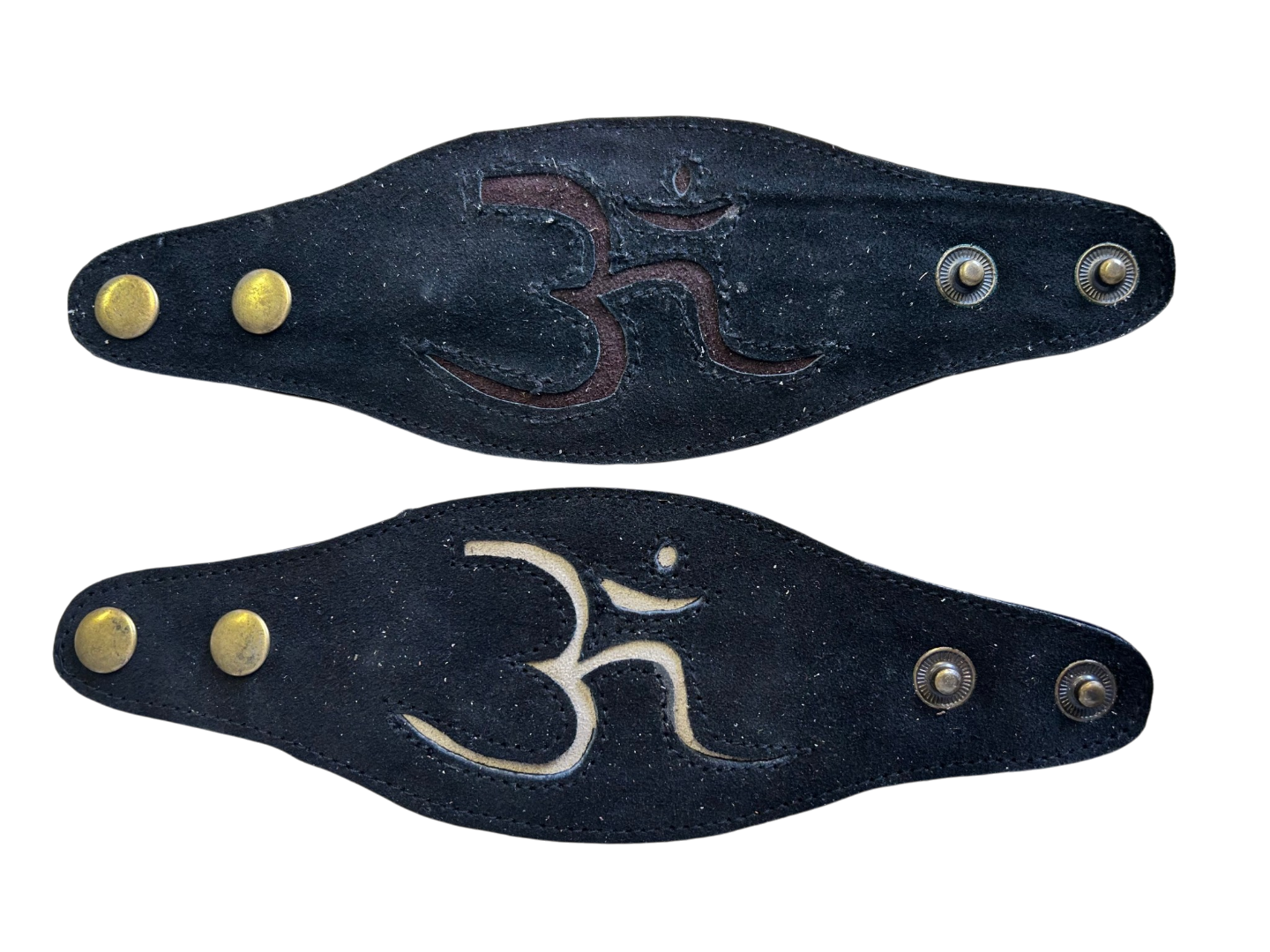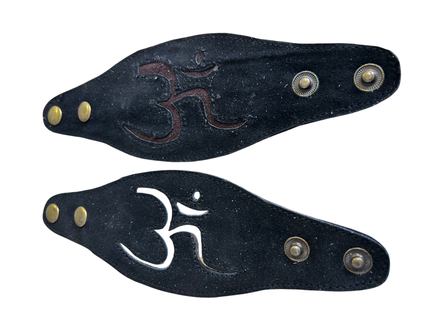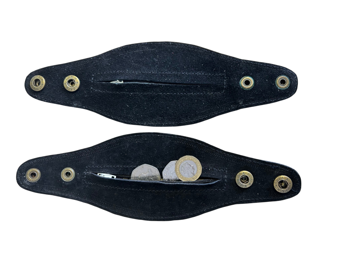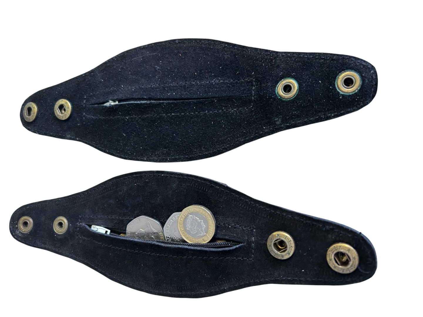 Description Pair of unique leather wrist pocket cuff bracelets featuring an embossed Om symbol design, combining practicality with a bold boho style. These wide black leather cuffs fasten securely with press studs and offer adjustable sizing. Each cuff includes a discreet zipped pocket on the inside, ideal for storing small items such as coins, folded notes, or other tiny essentials. A great accessory for festivals, travel, or everyday wear, with a distinctive spiritual or alternative look. Details: Pair of leather cuff bracelets Black leather with embossed Om symbol Hidden zipped pocket inside each cuff Press stud fastening with adjustable fit Suitable for most wrist sizes Unisex design Condition: Good used condition with visible signs of wear to the leather, adding to their vintage character. Zips and fastenings are in working order. Ideal for: Festival wear Boho or alternative fashion Travel security for small valuables Unique gift
