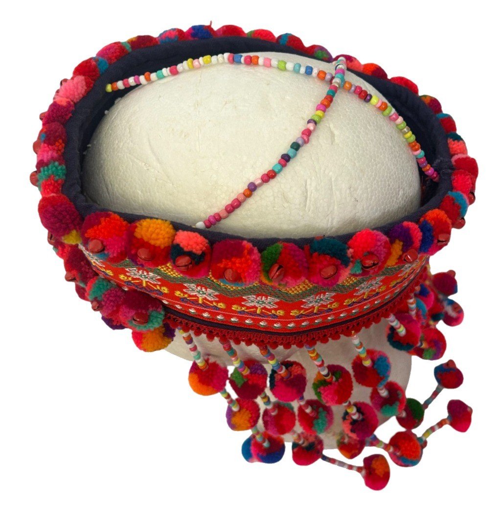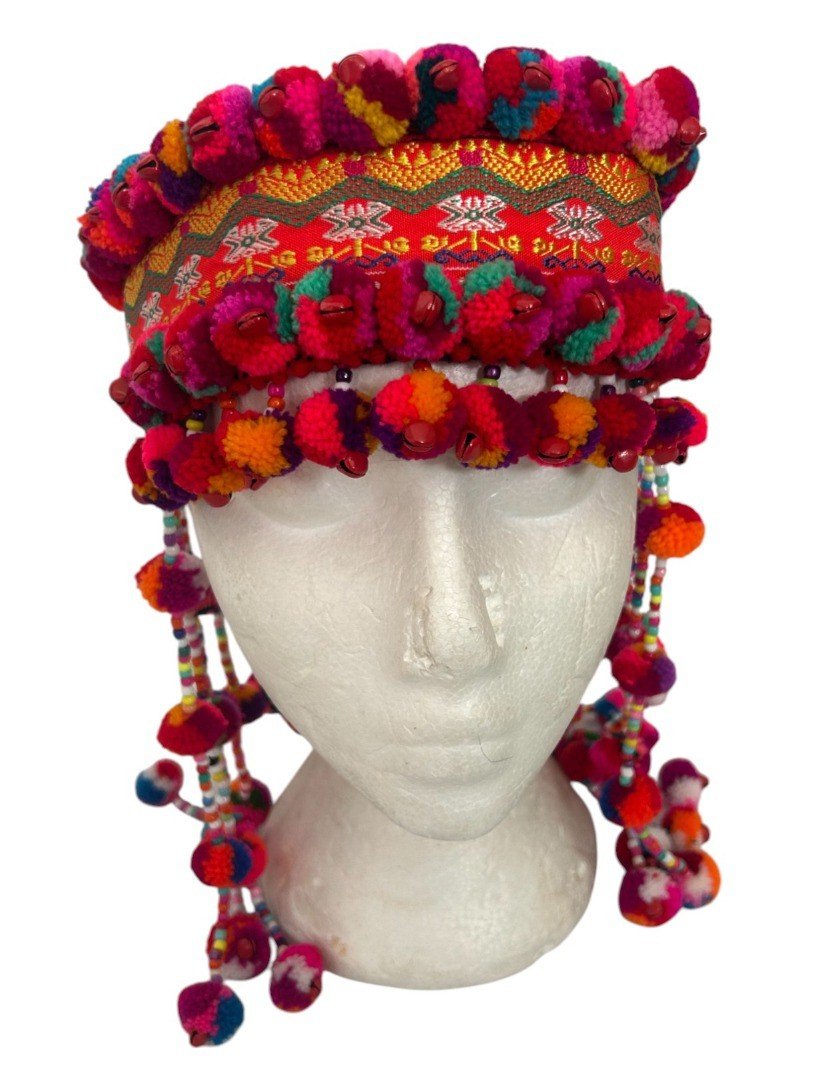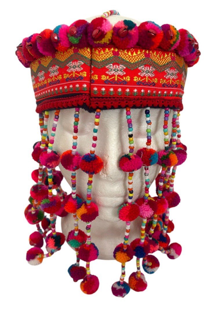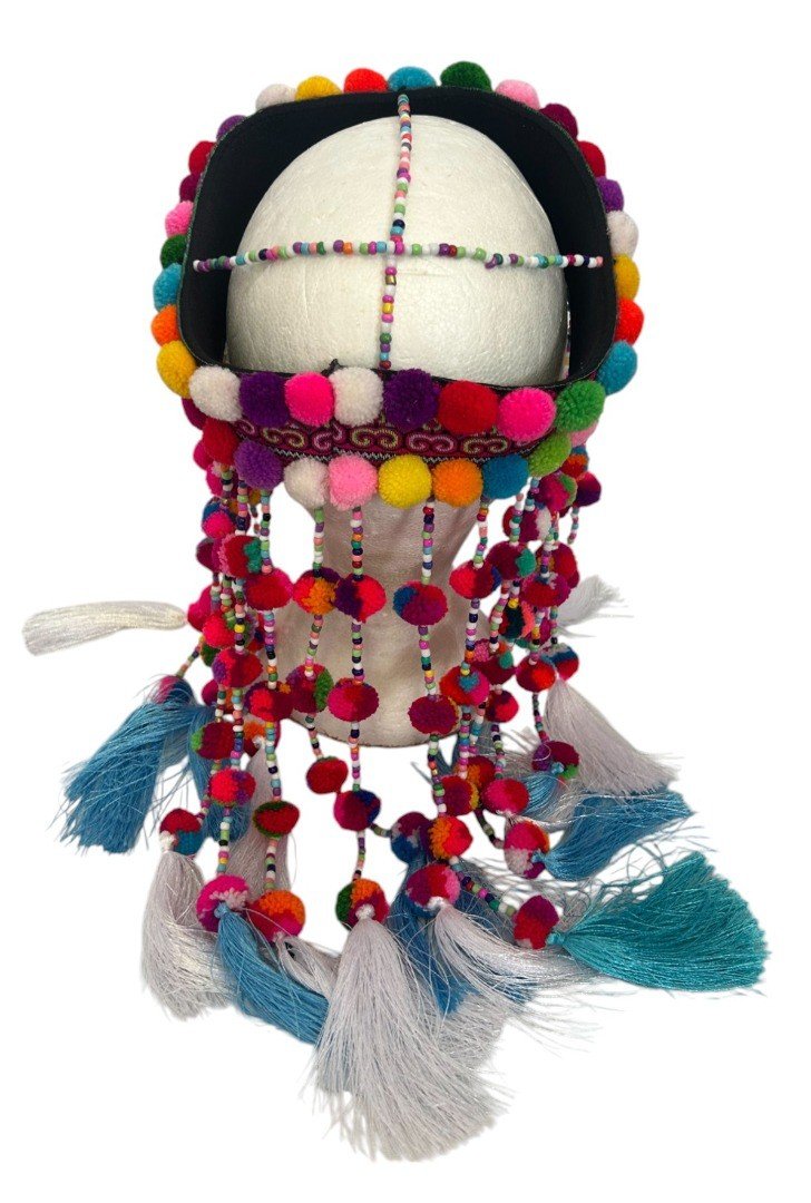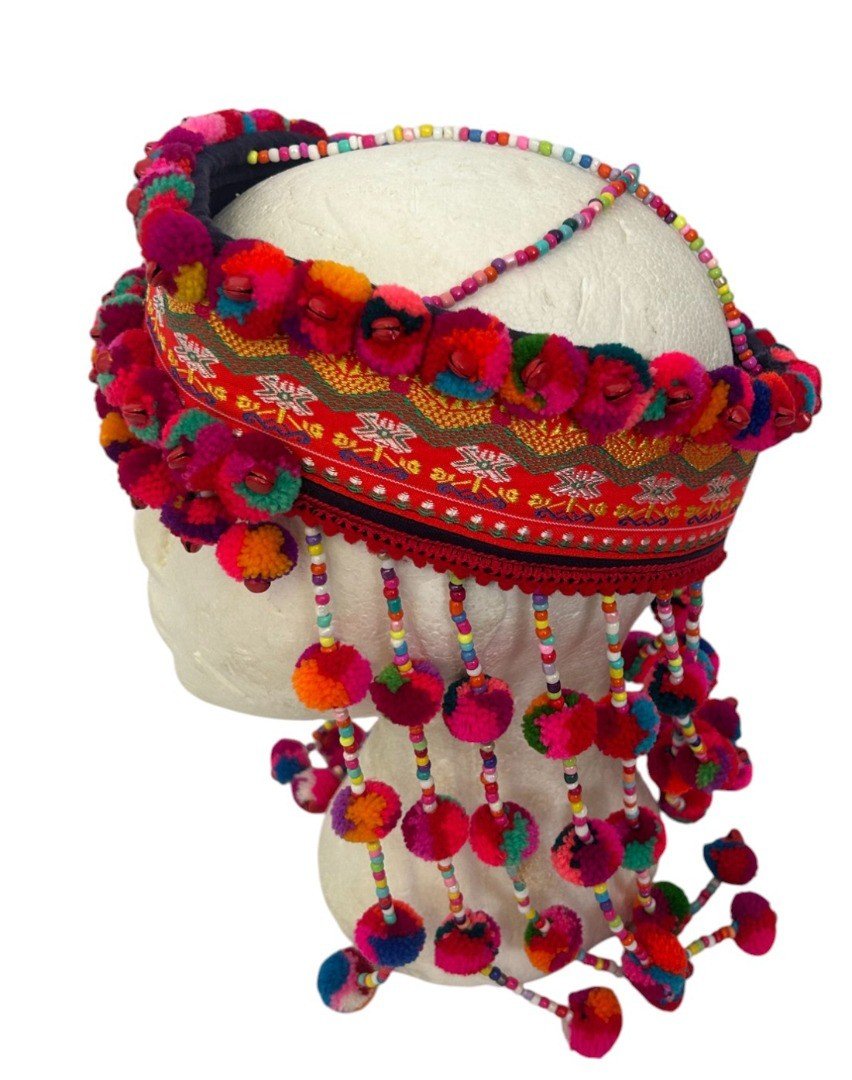 Description: A Beautiful Handmade Hmong Headdress Sourced from tribal artisans in Northern Thailand, Laos, and China. These headdresses are absolutely stunning on and perfect for festivals or collection. Key Features: Unique Artistry: Decorated with metal beads, bells, wool pompoms, and seeds. Fair Trade: We pay the makers a fair price for their intricate handiwork. Size: Fits a head size (approx. 55-57cm). Weight: Lightweight at approx. 210g. Condition: Brand New, Handmade. Please Note: As these are handmade and unique, the item you receive may have slight variations in the decorative pattern compared to the one pictured. AUTHENTIC ARTISAN CRAFTSMANSHIP: Beautifully handmade by tribal artisans in Northern Thailand, Laos, and China, using traditional textile techniques passed down through generations. FAIR TRADE & ETHICAL: We pay a fair trade price directly to the makers, reflecting the significant time and intricate skill required to create these unique headdresses by hand. VIBRANT & UNIQUE DESIGN: Decorated with hand-sewn metal beads, small brass-style bells, colorful wool pompoms, and natural seeds. Each piece is a unique work of art. SPECIFIC FIT: Designed for a relatively small head size, measuring approximately 55cm to 57cm. The interior is structured to sit securely and comfortably. STRIKING CULTURAL PIECE: Perfect for collectors, boho festival wear, or cultural display. Lightweight at approximately 210g for comfortable long-term wear.