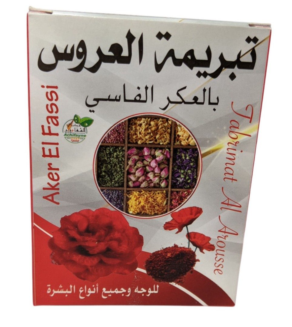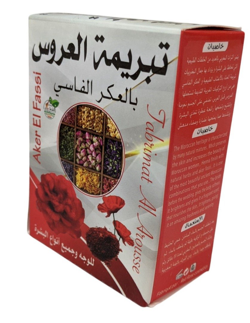Tabrima Sahraouiya with Aker Fassi 100g | Tabrimat Al Arousse | Personally Sourced | Fair Trade Discover Tabrina Sahraouia, a captivating powder composed of herbs. Immerse yourself in a unique sensory experience for nourished skin and a magical atmosphere. Commonly used as part of the Bridal Hamaam ritual – a day of relaxation, purification and getting beautiful for the big day. The bride will go to hammam with closest friends and relatives, have with her all the ancient Moroccan beauty secrets and that include the Tbrima Sahrawiya, deep clean the skin packed with large amount of natural ingredients will nourish, even skin tone, smooth, leaves the skin radiant and glowing.