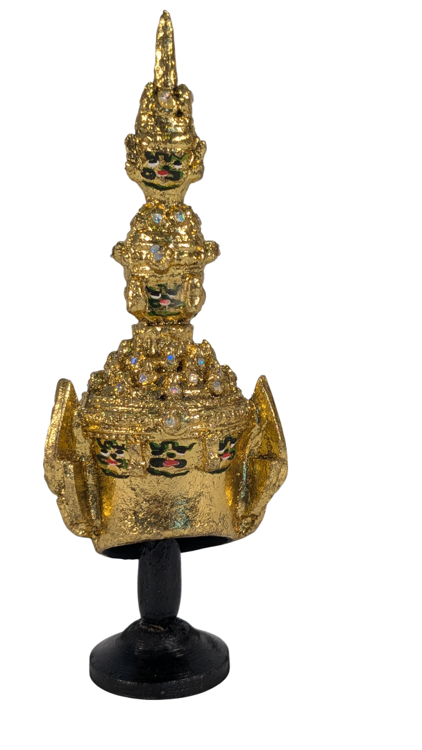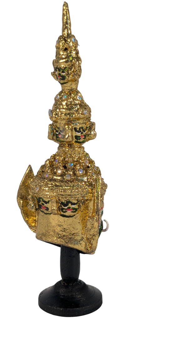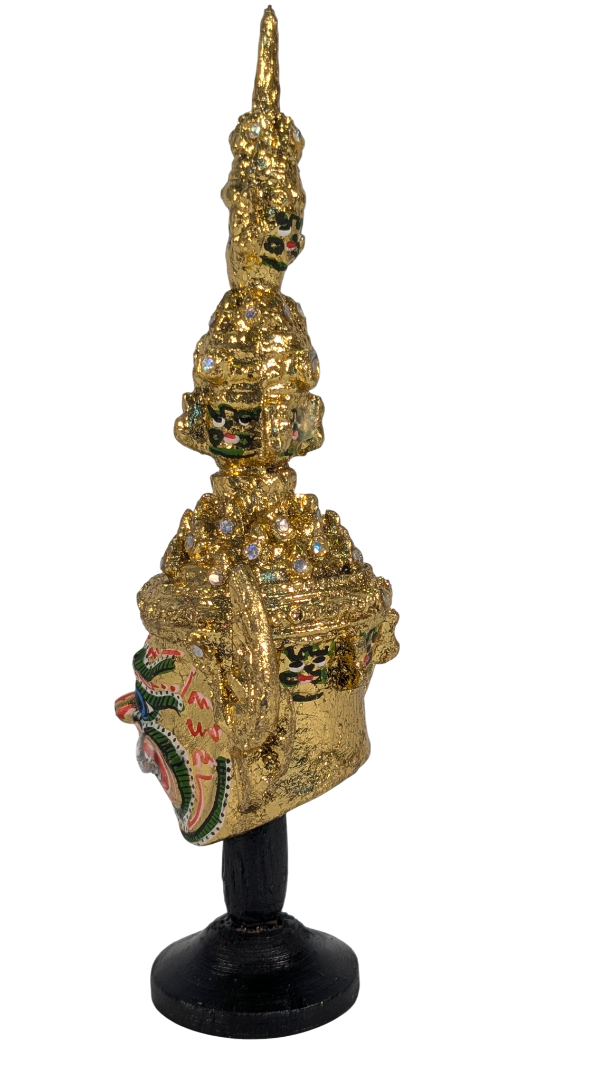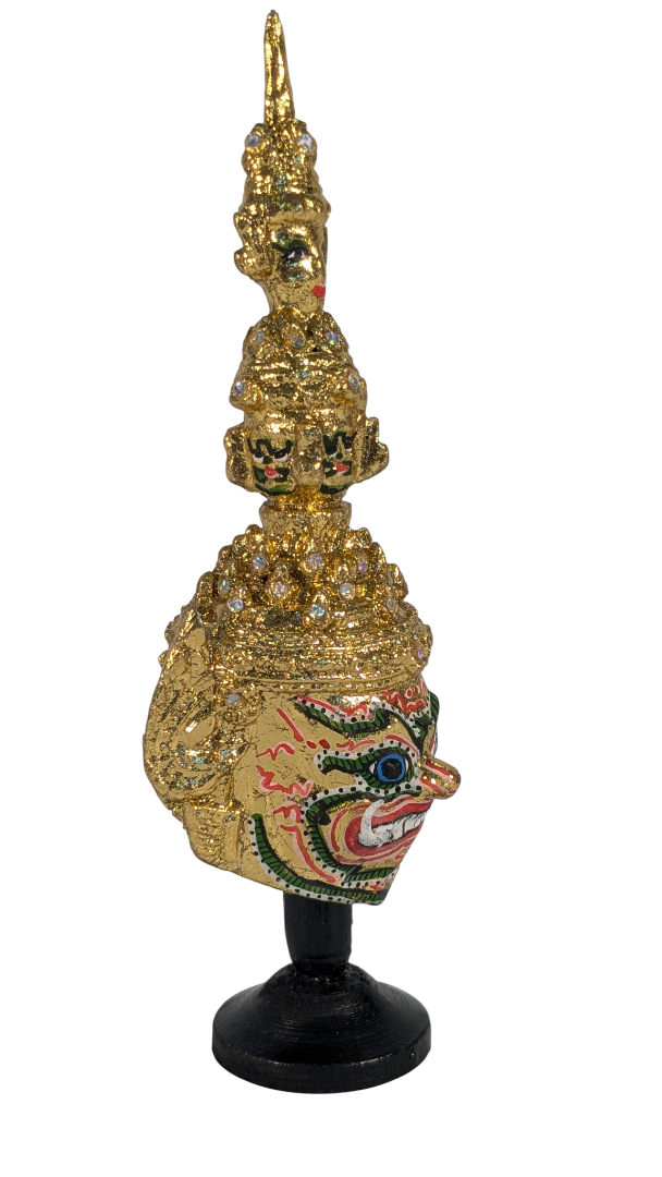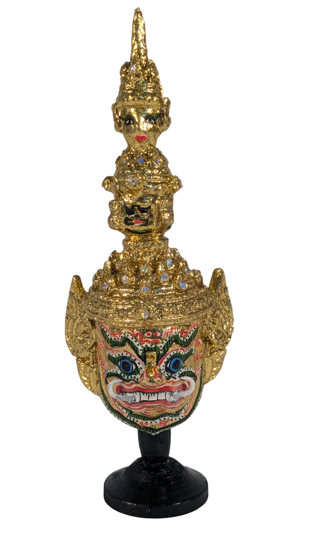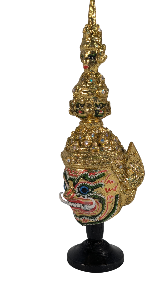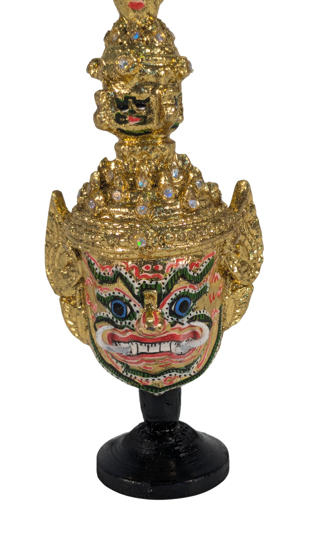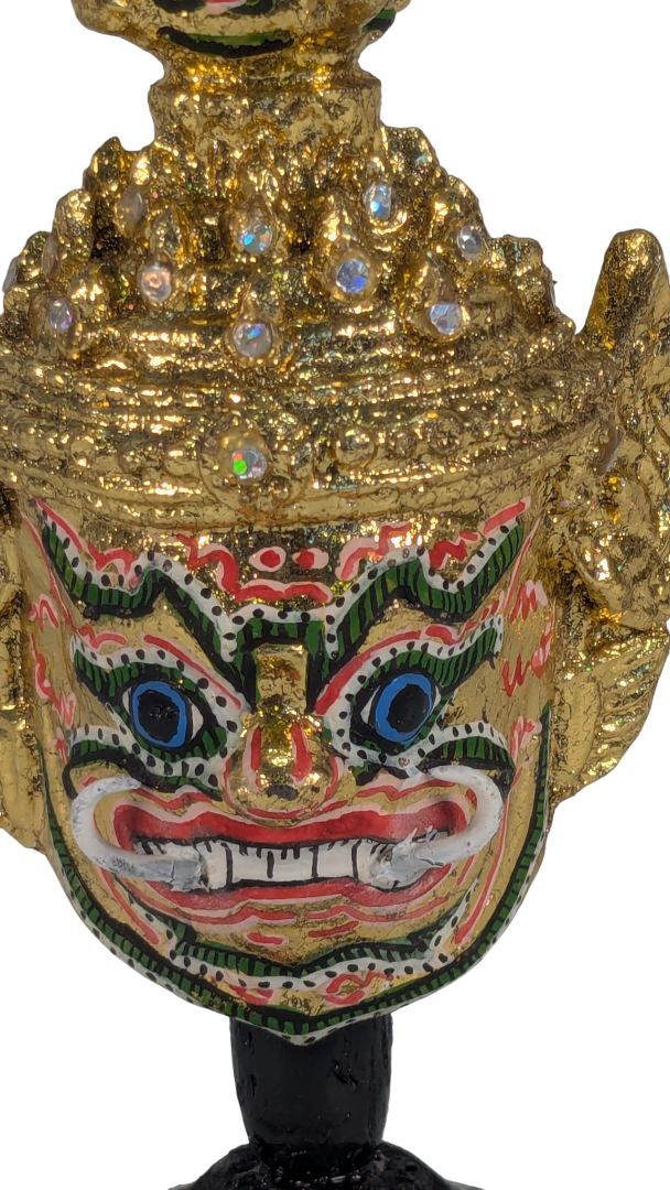 Thai Ramakien Khon Mask Miniature Statue – Gold Yaksha (Giant) Figure Representing authentic Thai culture and artistry in this miniature mask figure. Hand-painted with intricate detail depicting one of the iconic Yaksha (Giants/Demons) from the Ramakien, Thailand’s national epic, which forms the basis for the classical Thai masked dance, Khon. This highly decorative item captures the imposing spirit of the mythological giants, traditionally recognized by their fierce expressions, prominent fangs, and elaborate, towering crowns. The colors and style are authentic to the Khon theatrical tradition for these characters. Key Features: Iconic Character: Represents a Yaksha (Giant) from the Ramakien epic. Authentic Thai Artistry: Based on the traditional style of Khon (masked dance) headpieces. Vibrant Detail: Hand-painted features include bright blue eyes, fierce facial markings (red and green), and prominent fangs. Luxurious Finish: The mask and tiered crown are finished in a brilliant, glittering gold colour, accented with embedded faux jewels/sparkles. Sourced Directly: Acquired from the renowned Chatuchak Weekend Market in Bangkok, a hub for high-quality Thai handicrafts. Dimensions: Height Approx 18cm (7 inches) Widest Point: approx 9cm (3.5 inches) Base DIameter: approx 4cm (1.6 inches) New handmade condition. Please review all photos for the best representation of the item’s handcrafted nature, painting detail, and finish. Please note there may be differences due to hand made nature. Thai Ramakien Khon Mask Miniature Statue – Gold Yaksha (Giant) Figure Representing authentic Thai culture and artistry in this miniature mask figure. Hand-painted with intricate detail depicting one of the iconic Yaksha (Giants/Demons) from the Ramakien, Thailand’s national epic, which forms the basis for the classical Thai masked dance, Khon. This highly decorative item captures the imposing spirit of the mythological giants, traditionally recognized by their fierce expressions, prominent fangs, and elaborate, towering crowns. The colors and style are authentic to the Khon theatrical tradition for these characters. Iconic Character: Represents a Yaksha (Giant) from the Ramakien epic. Authentic Thai Artistry: Based on the traditional style of Khon (masked dance) headpieces. Vibrant Detail: Hand-painted features include bright blue eyes, fierce facial markings (red and green), and prominent fangs. Height Approx 18cm (7 inches) Widest Point: approx 9cm (3.5 inches) Base DIameter: approx 4cm (1.6 inches) Sourced Directly: Acquired from the renowned Chatuchak Weekend Market in Bangkok, a hub for high-quality Thai handicrafts. Please note there may be differences due to hand made nature.
