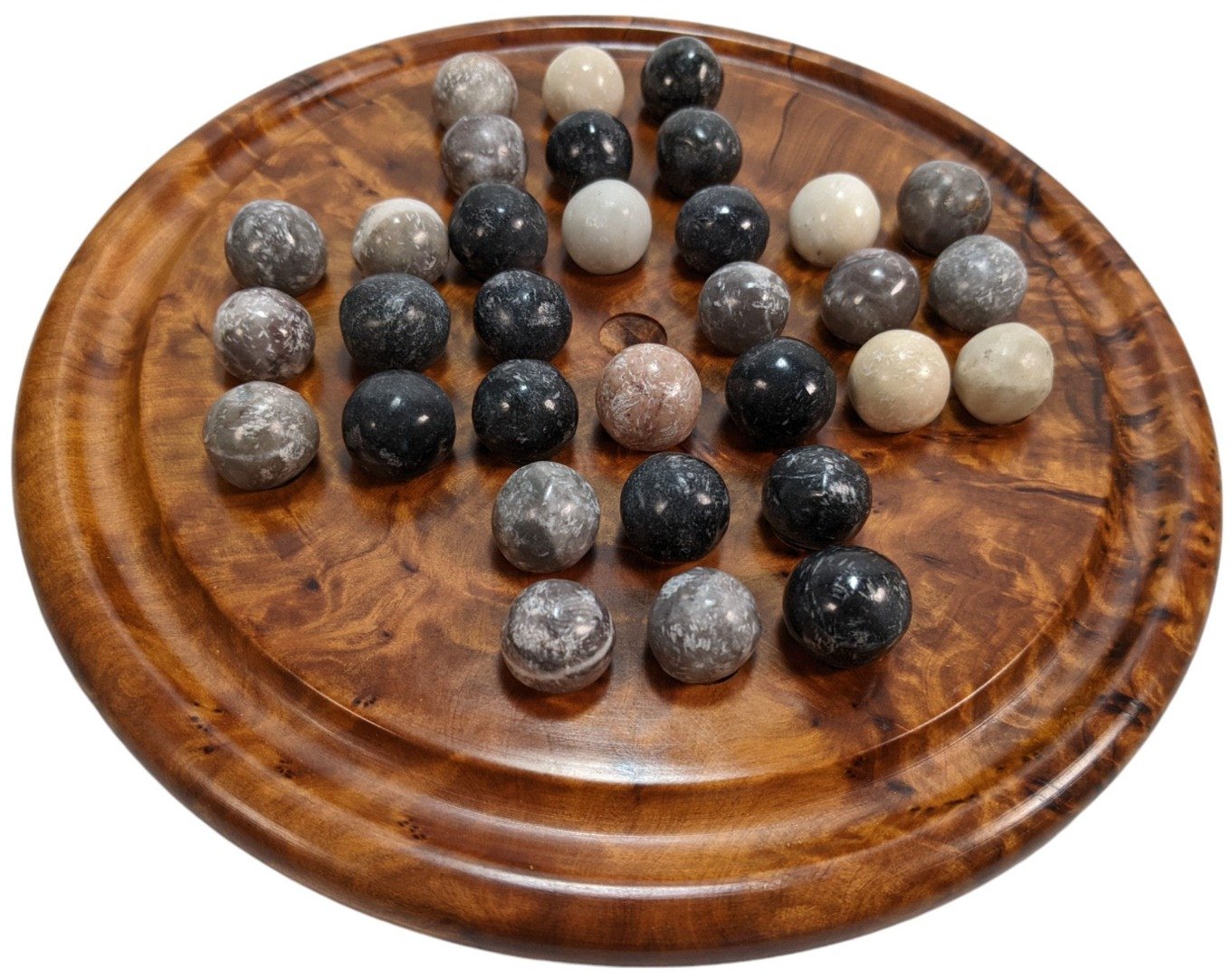 Dimensions Thuya Wood Solitaire Set: 20 x 20 x 3cm / 8″ x 8″ x 1″. Total unpacked weight = 650g / 1.43lbs The pieces are made of stone and are also hand made to expect some delightful irregularity in them. A full set of 32 marbles comes with the game.
