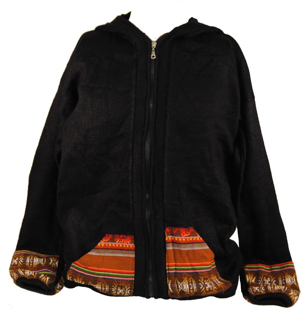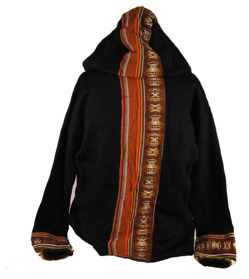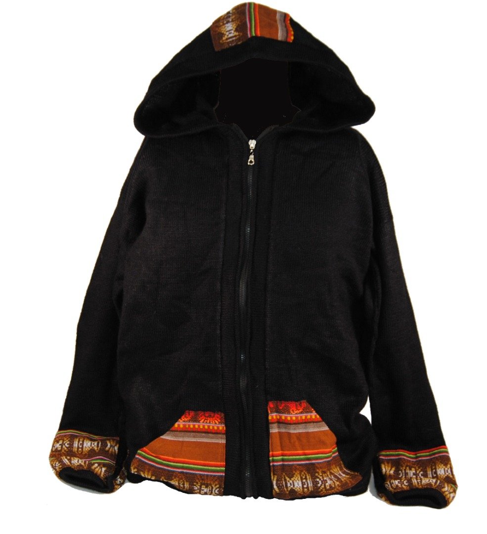 Tribal Hoody – Fair Trade Cool Alpaca South American Hooded Top Jacket – XL Black