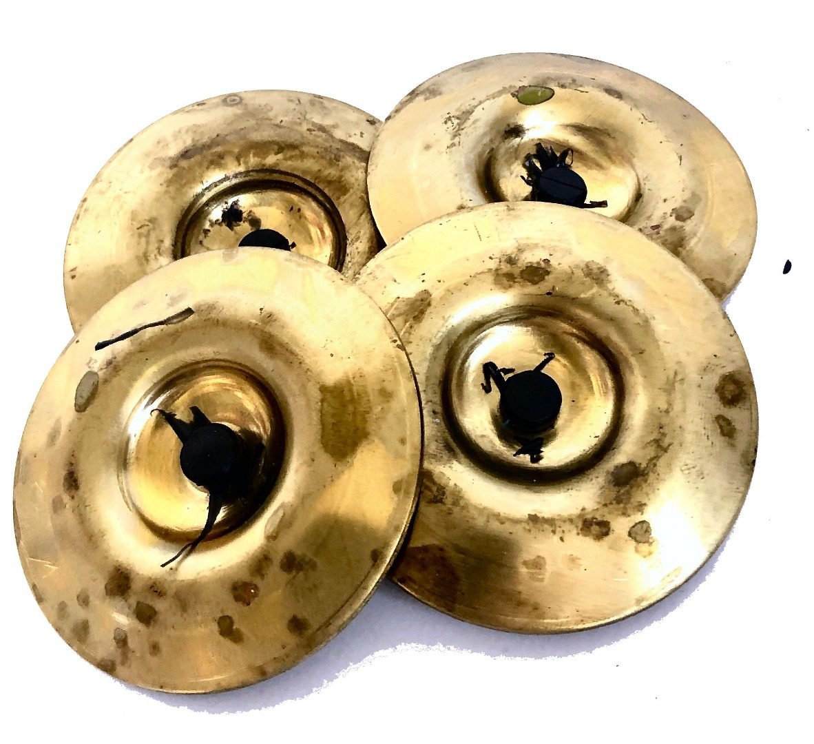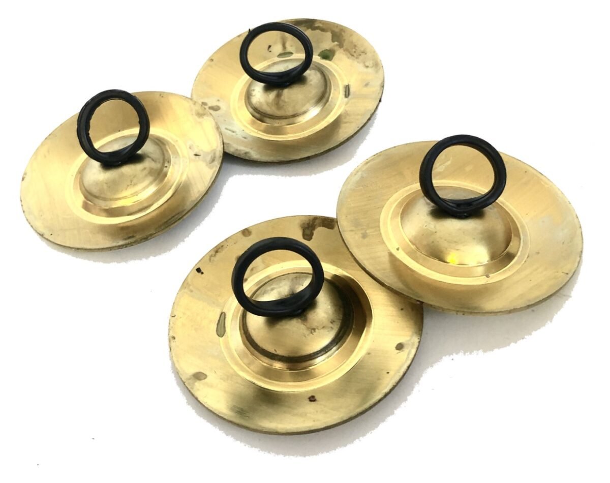 Finger cymbals, are part of a family of musical instruments known as clappers. Clappers are musical instruments made of wood, bone, metal, and other substances that are played by being struck against each other. Clappers come in pairs and are often held in the hands, fastened together, or strapped to the performer’s fingers. The clapper family also includes spoons, bones and castanets.