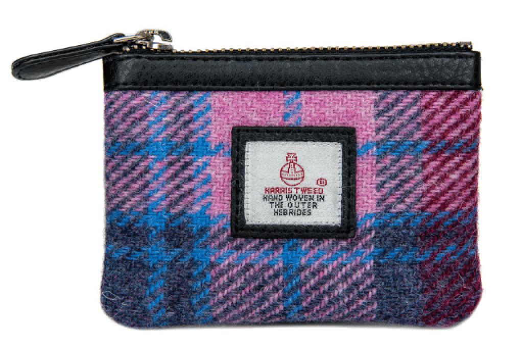 Tweed Coin Purse – a genuine Scottish product. Beautifully crafted purse and made from hand-woven Genuine Harris Tweed combining traditional Hebbridean handicraft with contemporary design. Please note this is for the pastel pink purse, the other images are to show size