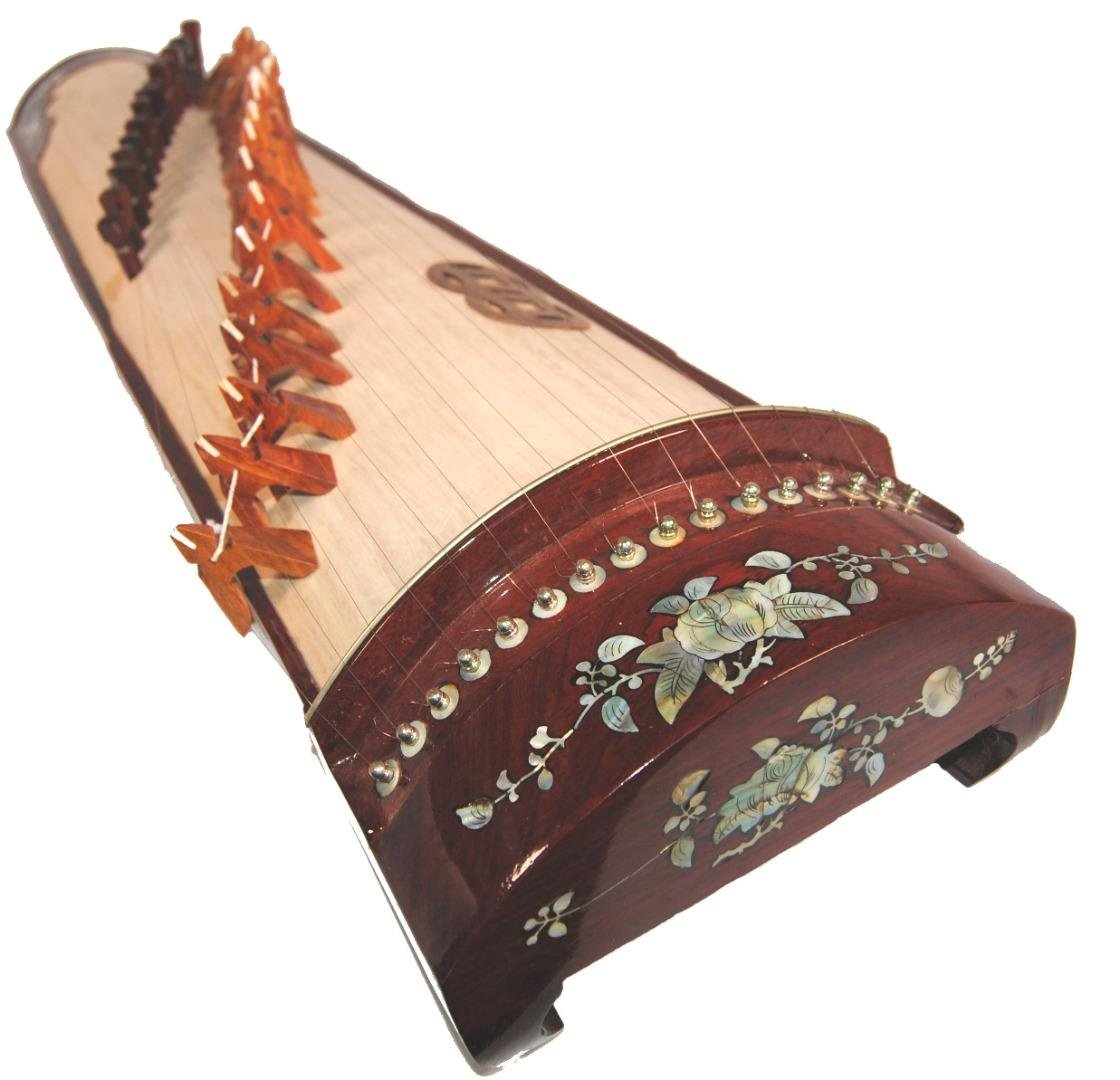 Please note: this has had a small repair on a section of the bridge. it was a clean break which was repaired with wood glue. I have included pictures before and after the repair. We have taken 50 off the price The only other damage is cosmetic. There are some marks on the wood on the top where the string stands have rubbed against it in transit. The bridge section will be packed sperately to avoid any damage like this in trasnit. it has been shipped to us from Vietnam with tightened strings. Dan Tranh Dimensions: 80 x 20 x 12cm (31″ x 8″ x 5″) Weight: approx 1.5kg Extremely hard to find traditional Vietnamese instrument. It has 16 strings and is played with a plectrum or pick. It is a beautiful instrument, made from wood and features inlaid mother of pearl designs depicting scenes from Vietnamese life.There are moveable bridges used for tuning and support. The bridges are made of wood. Included: 1 x 80cm Dan Tranh 1 x goat horn plectrum 1 x Soft Case More Information The dan tranh is a plucked zither of Vietnam, based to the Chinese guzheng. The same root is also Japanese koto, the Korean gayageum and ajaeng, the Mongolian yatga, the Sundanese kacapi and the Kazakh jetigen. It has a long soundbox with the steel strings, movable bridges and tuning pegs positioned on its top. The dan tranh can be used either as a solo instrument, as part of various instrumental ensembles or to accompany vocal performances. The soundbox consists of a curved top plate, a flat bottom plate, and six side-pieces. The top and bottom plates are usually made of Paulownia wood. The side-pieces as well as the bridges, and tuning pegs and the two small legs are made of hard wood. The movable bridges have the shape of the letter V turned upside down, and their sizes varies according to their position: The one for the lowest string is the largest. The higher their position, the smaller their size is. The strings are made of steel and have varying diameters. They are tuned to the pentatonic scale. Performers pluck the strings with the right hand and bend the strings with the left hand to create a wide range of microtonal and tonal ornaments. In traditional music, performers use 2 or 3 fingers (thumb and index, or thumb, index and middle fingers) to pluck the strings. In a number of new compositions, as many as four or five fingers may be used to pluck the strings. In these new works, the left hand may also be used to enable the performer to play two simultaneous parts. Sometimes, ?n tranh will play with bow, the player traditionally bowing the strings to the right of the bridges while the left hand varied pitch and vibrato by pressing the strings on the other side of the bridges.
