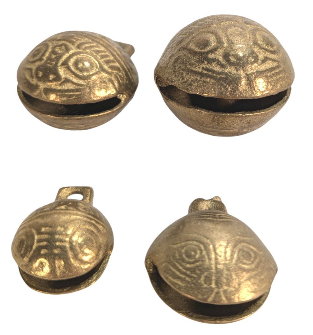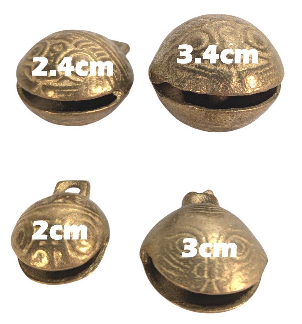 Approx Dimensions: The size stated here refers to the maximum diameter of the bells. there may be slight measurement error +/- 1mm / 1 gram. smallest 2cm / 0.8 inches. Weight 7g / 0.25oz 2nd 2.5cm / 0.95 inches. Weight 11g / 0.39oz 3rd 3.1cm / 1.2 inches. Weight 22g / 0.78oz largest 3.4cm / 1.3 inches. Weight 29g / 1oz The making of these bells is a traditional craft in Vietnam and one that sadly is dying out. Here at terrapin Trading we strive to support grassroots crafts.