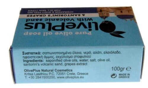 Contains natural olive oil with Santorini’s Volcanic sand & Santorini’s grapes.