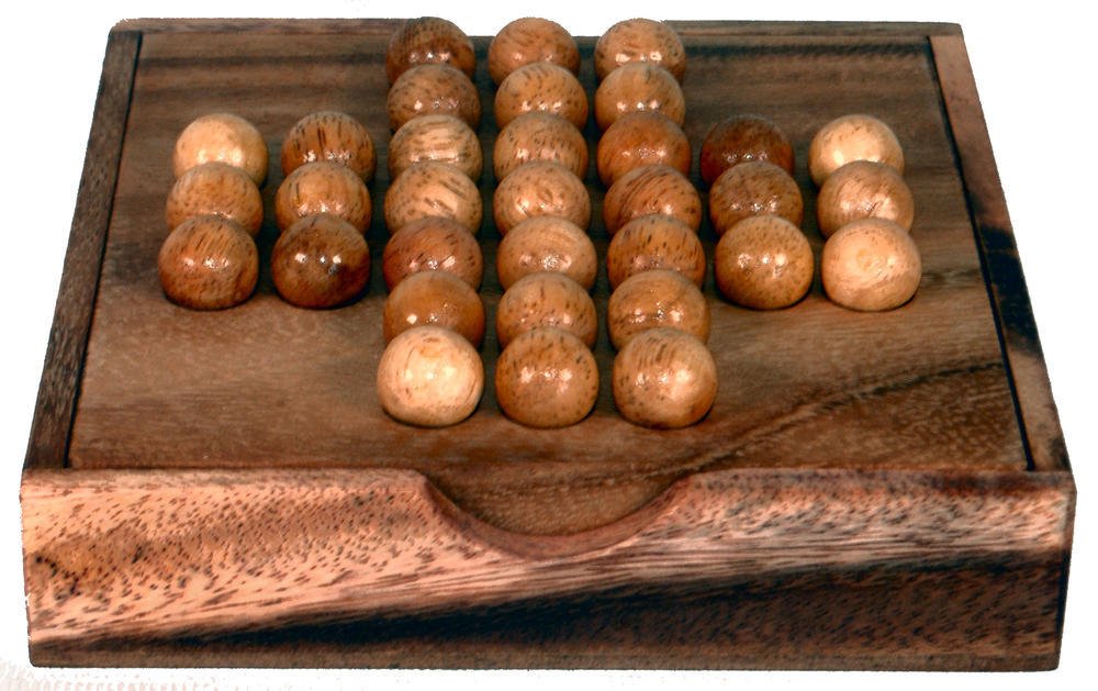 Peg solitaire (or Solo Noble) is a board game for one player involving movement of pegs on a board with holes. Some sets use marbles in a board with indentations. The game is known simply as Solitaire in the United Kingdom where the card games are called Patience. It is also called Brainvita (mainly in India, where sets are sold commercially under this name).