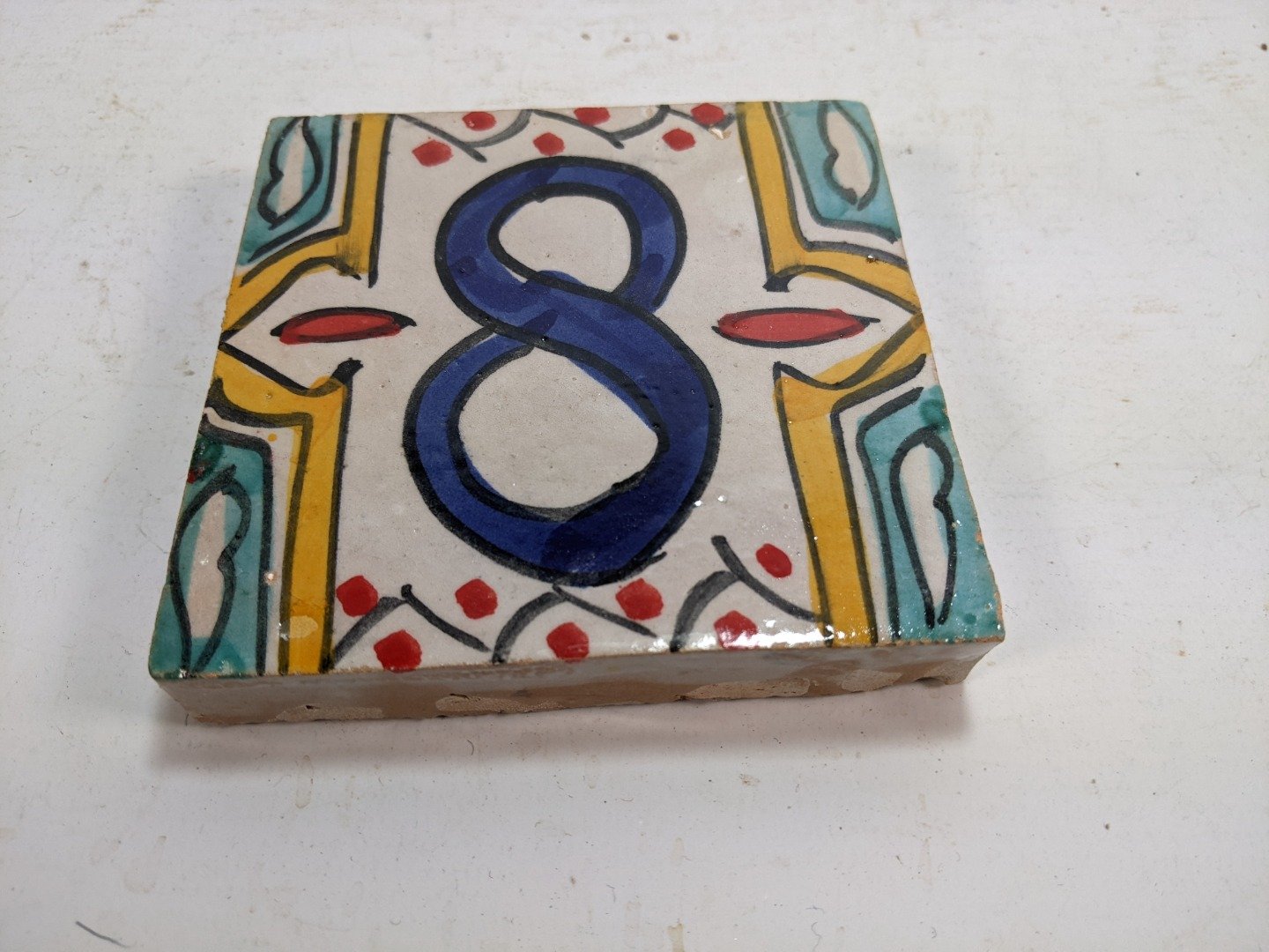 Zellige Number Tile EIGHT – A beautiful handmade, hand painted and hand-glazed Tile Can be used internally or externally. Personally Sourced in Morocco direct from the maker.